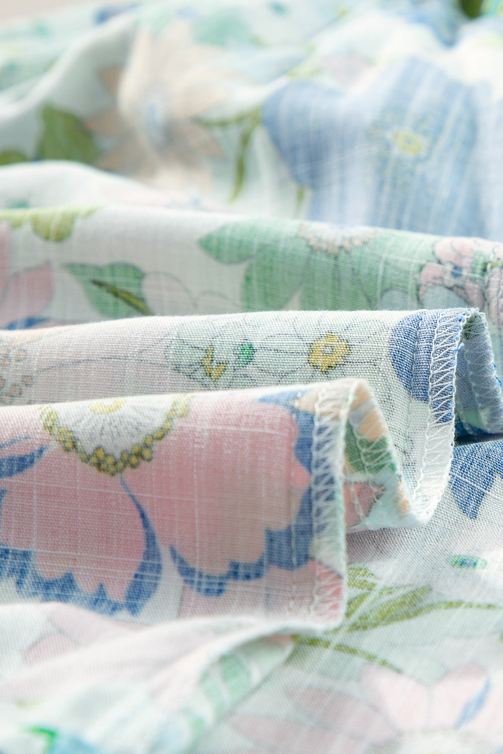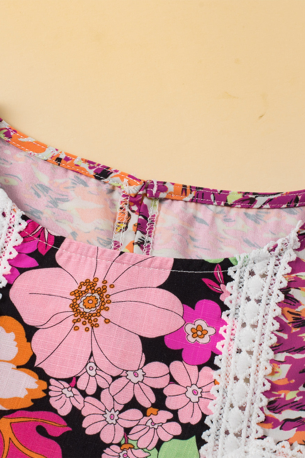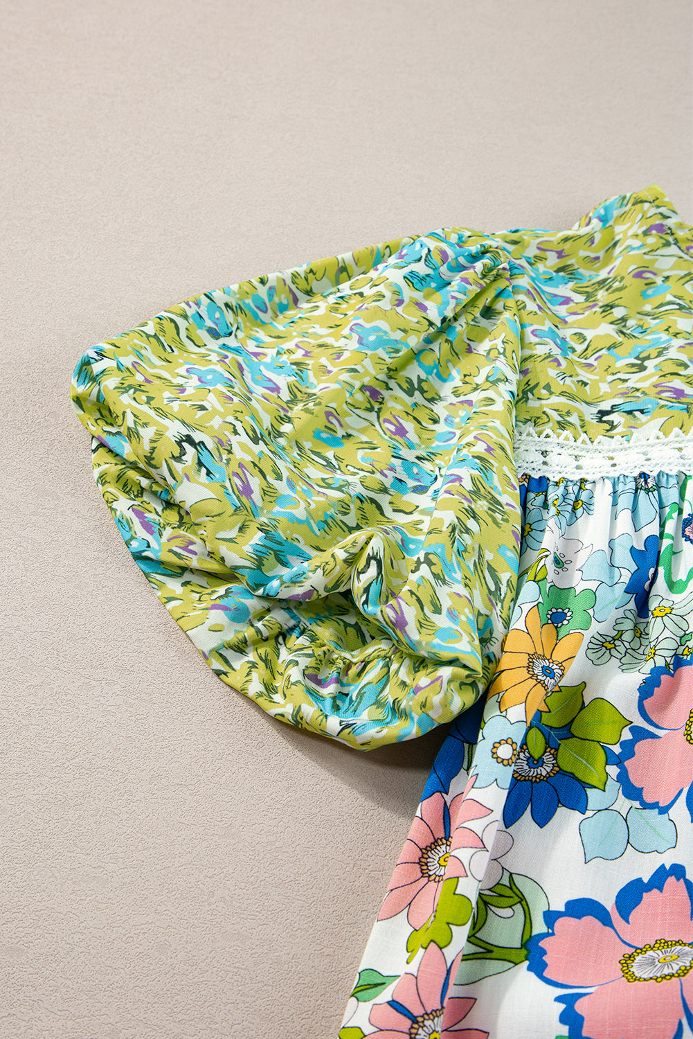 Green Bubble Sleeve Lace Trim Floral Mixed Print Blouse