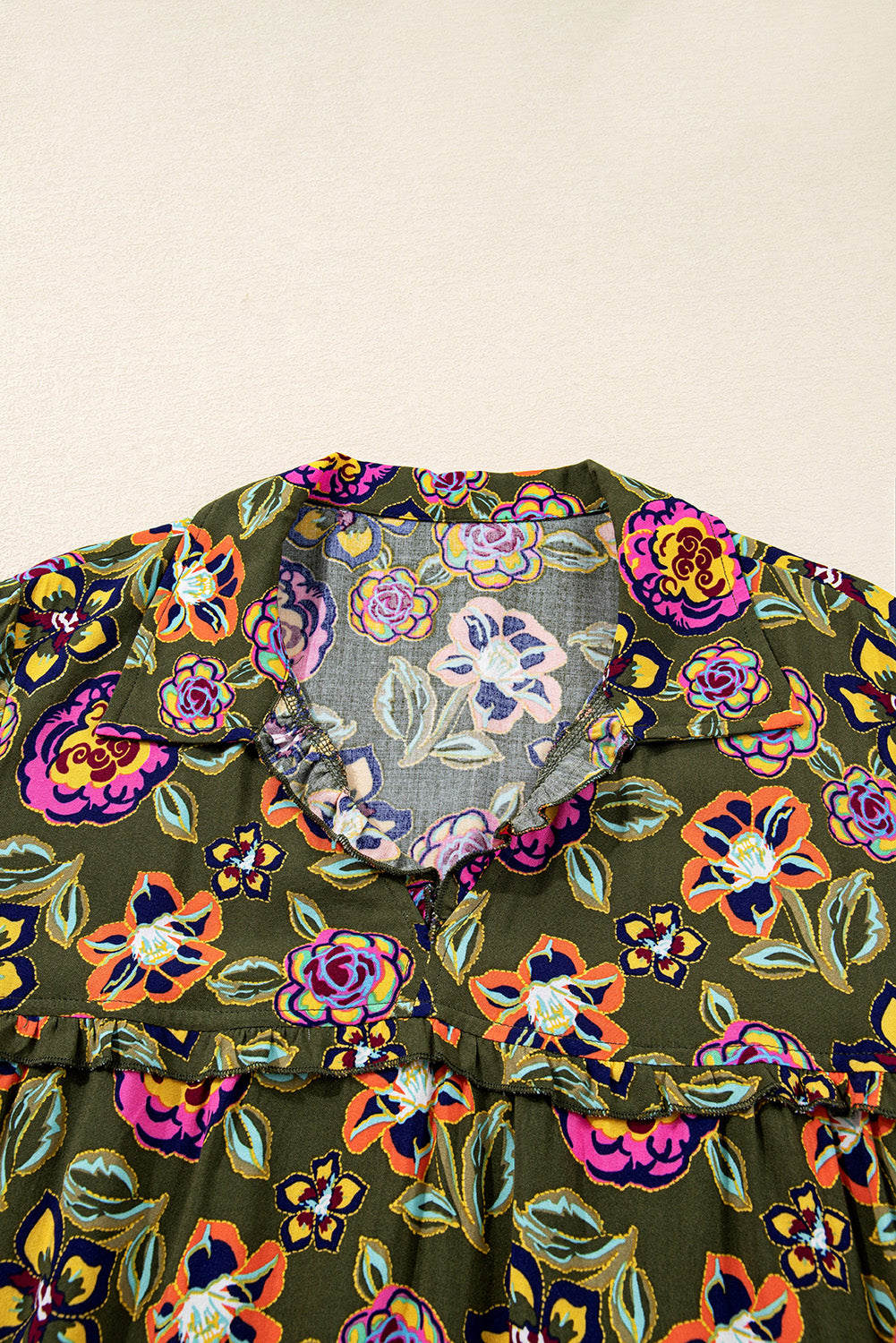 Green Floral Print Split Neck Bubble Sleeve Shift Mini Dress