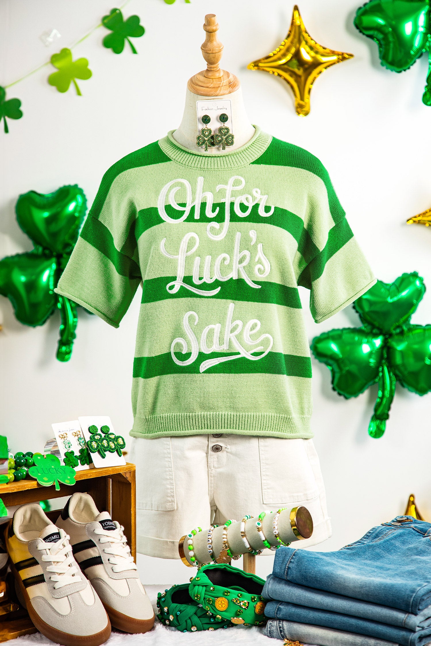 Green Stripe Oh for Lucks Sake St Patricks Day Short Sleeve Sweater