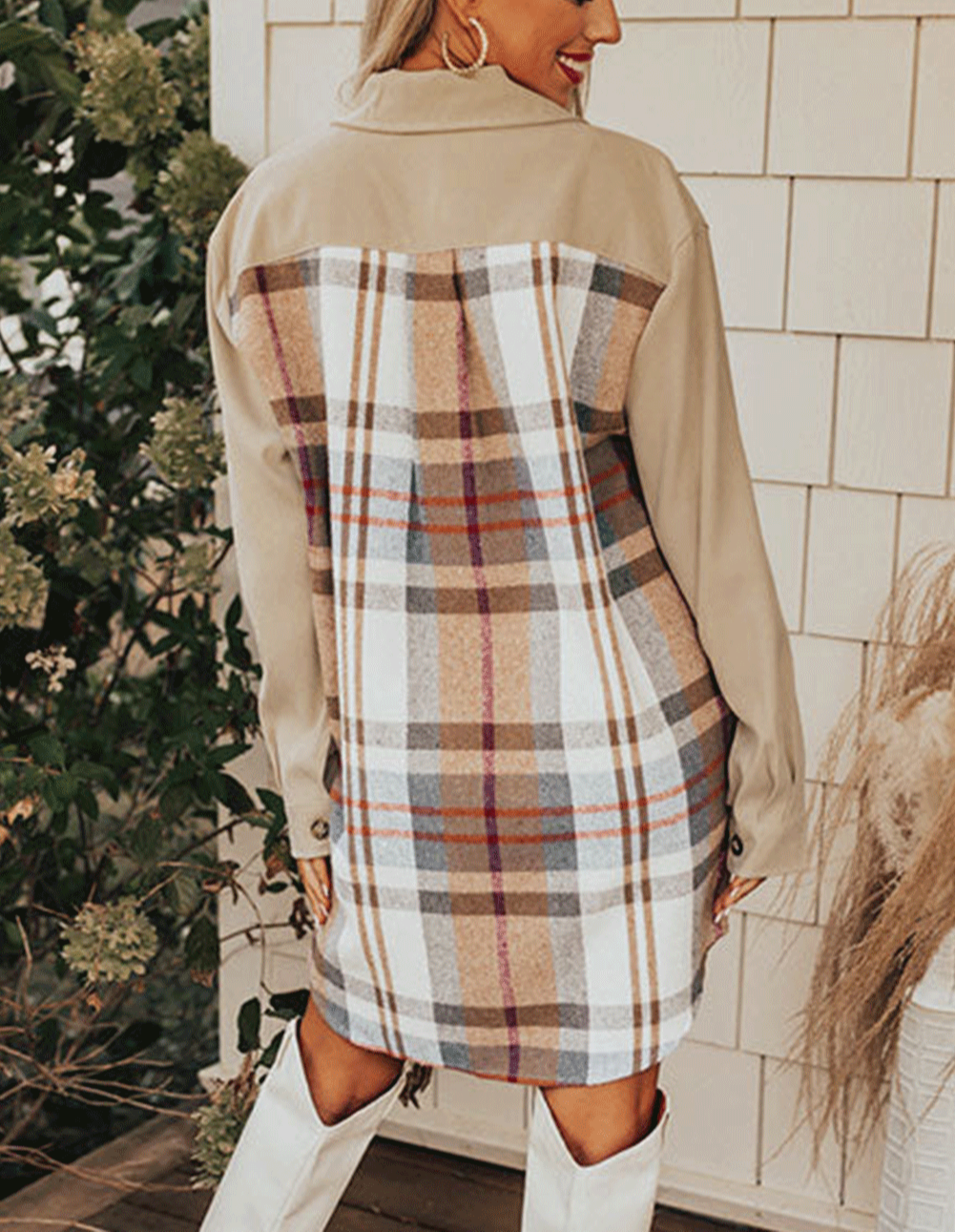 Khaki Plaid Patchwork Long Sleeve Shirt Mini Dress