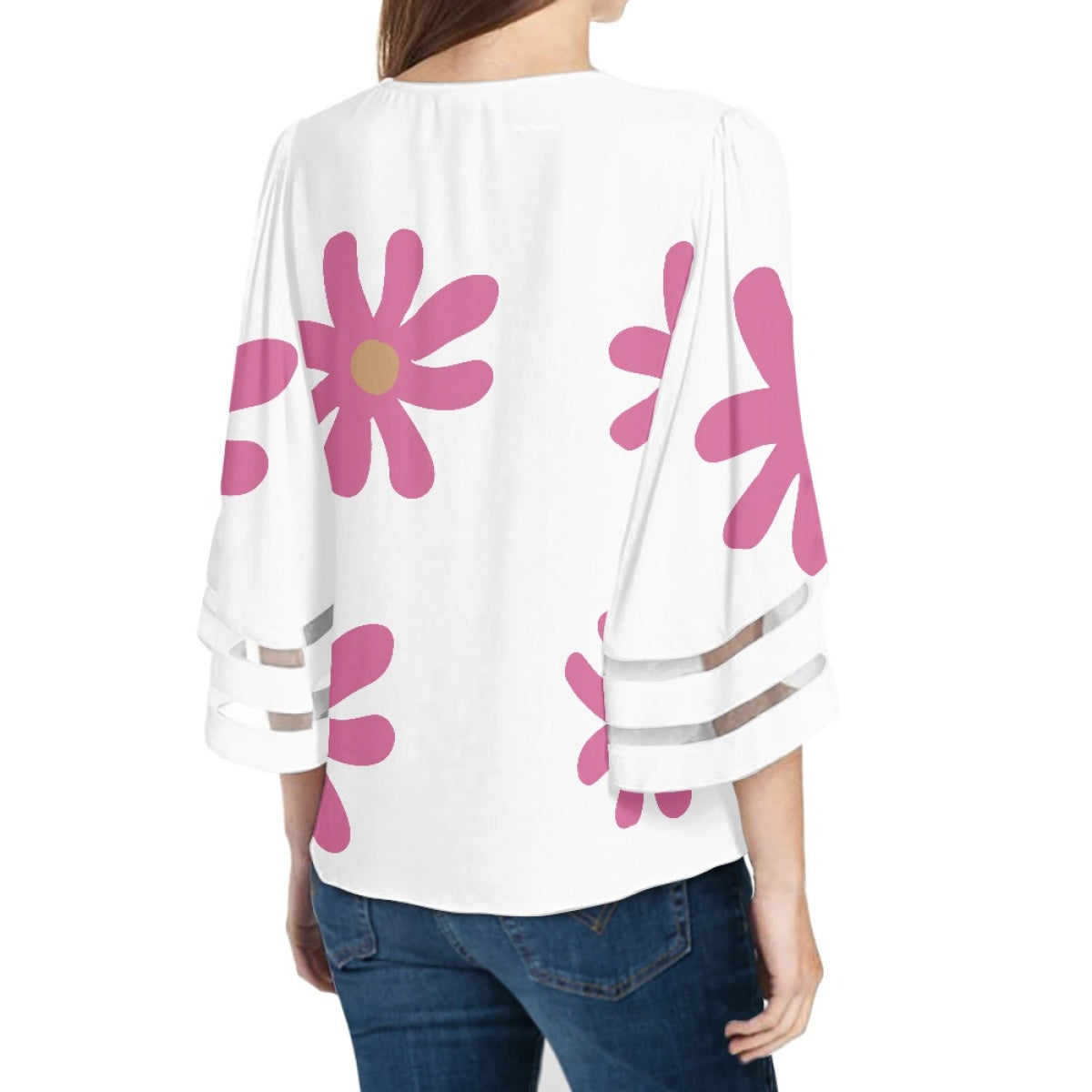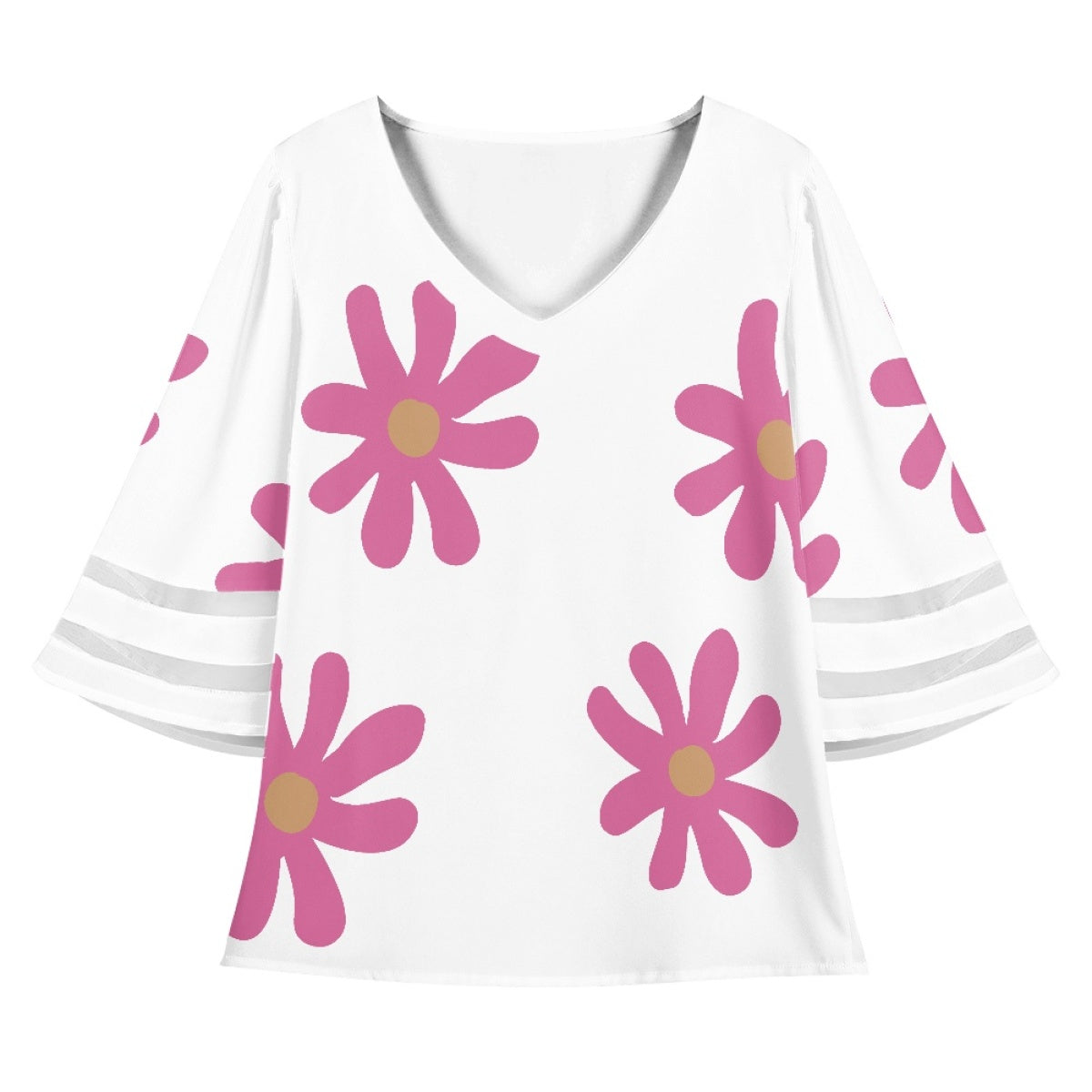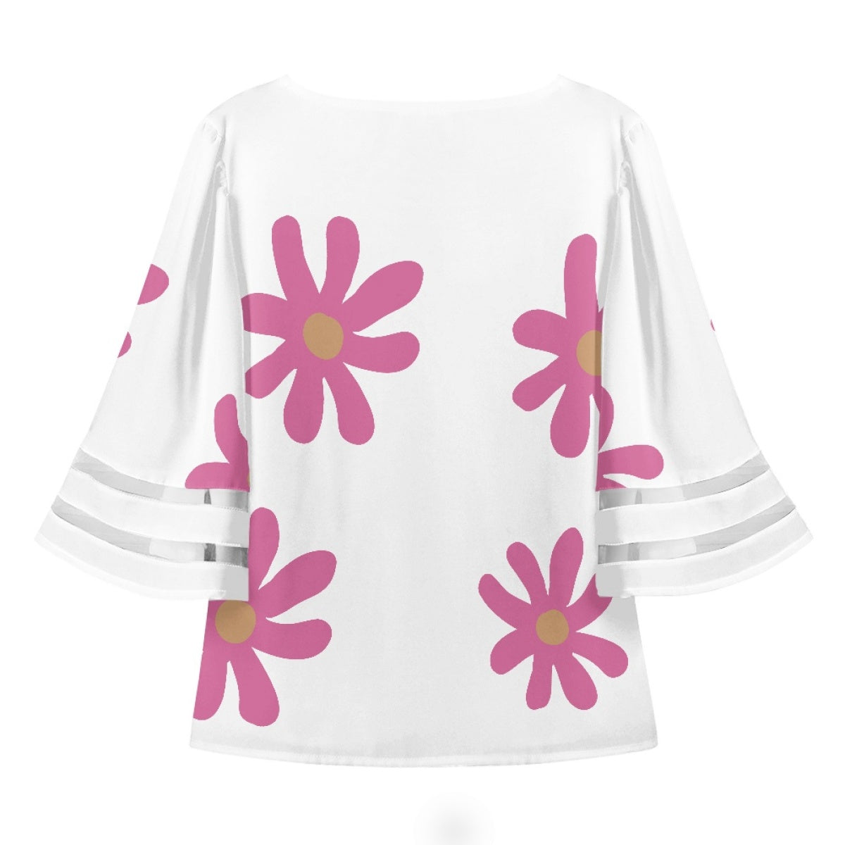 Lace Trimmed Chiffon Top With Pink Flowers On White Background