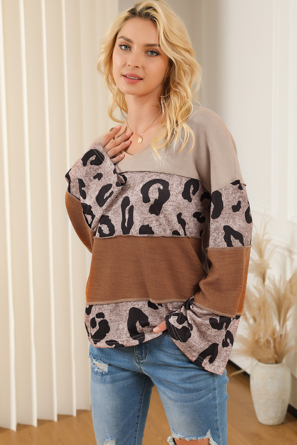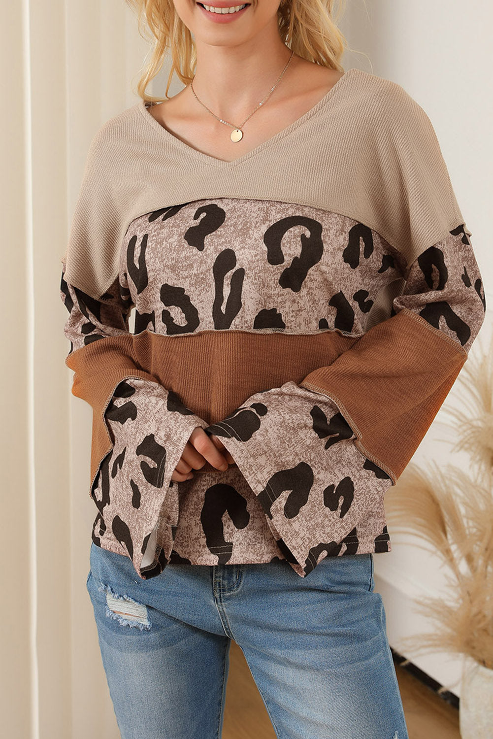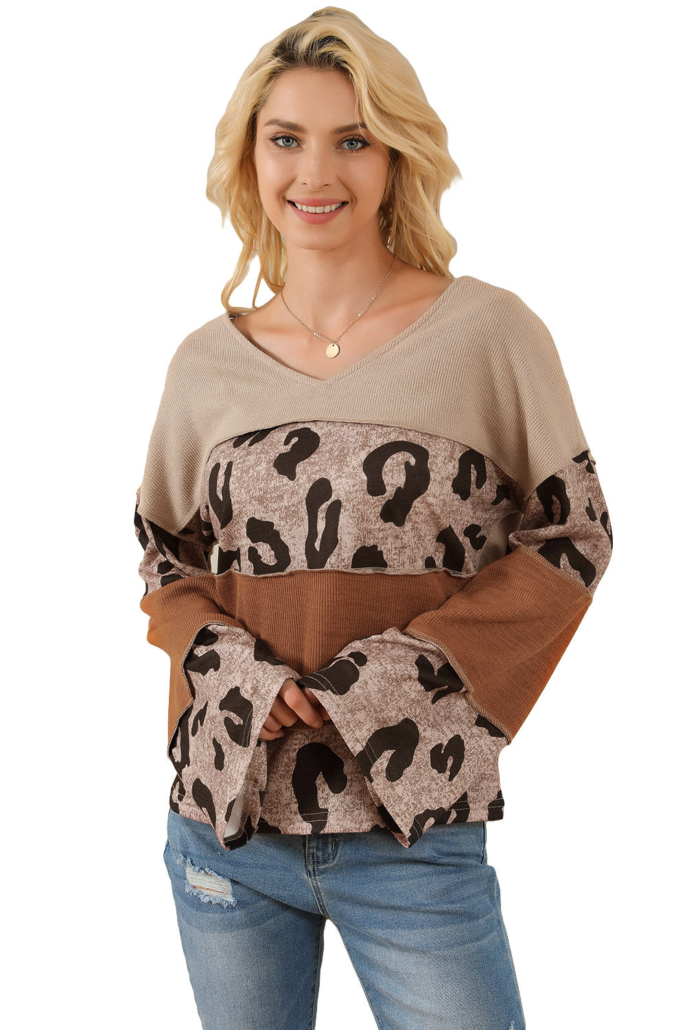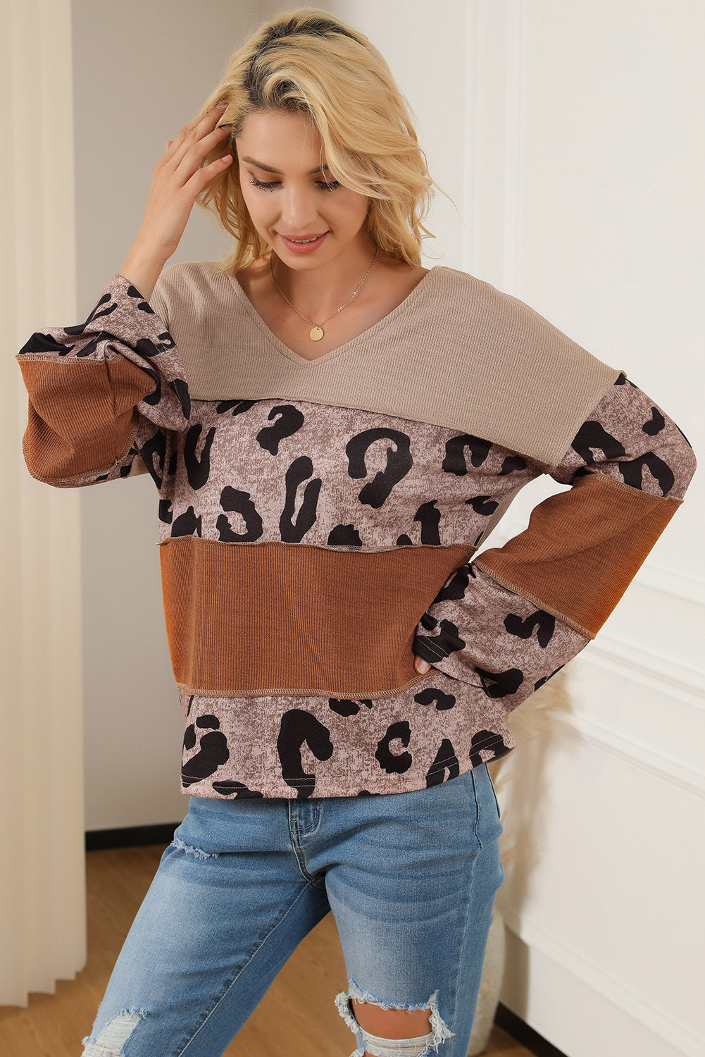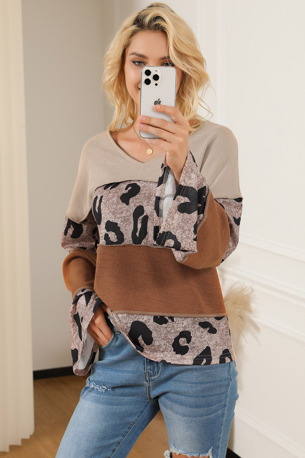 Leopard Colorblock Patchwork V-Neck Loose Sleeve Knit Top