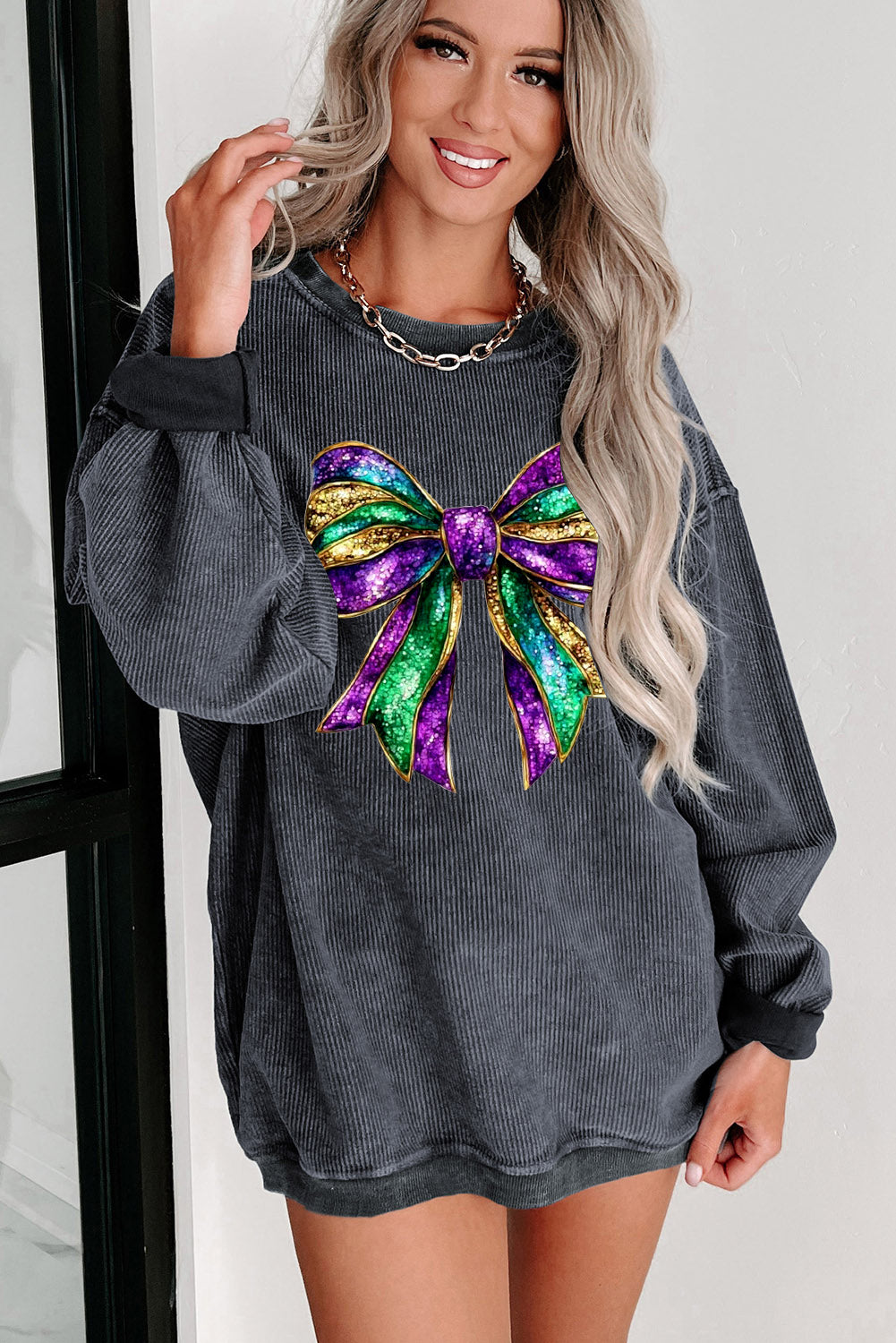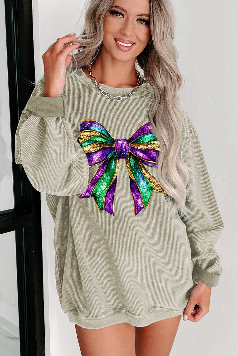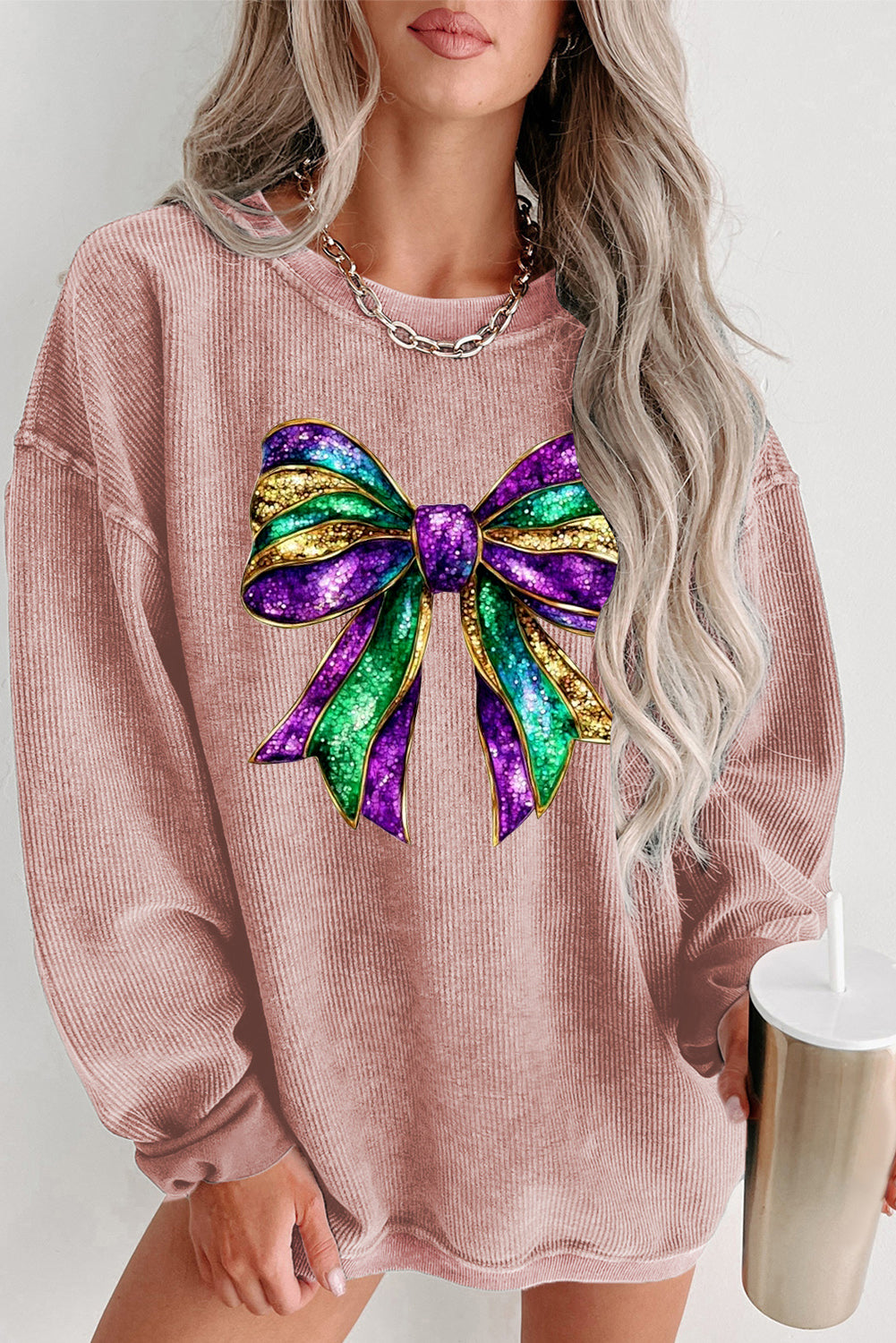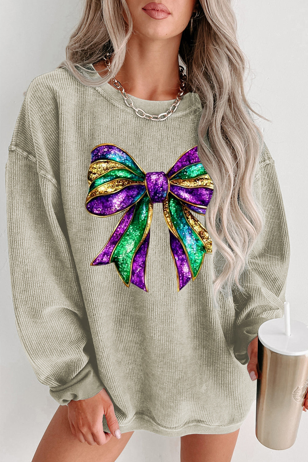 Mardi Gras Celebration Bow Print Oversized Knit Sweatshirt