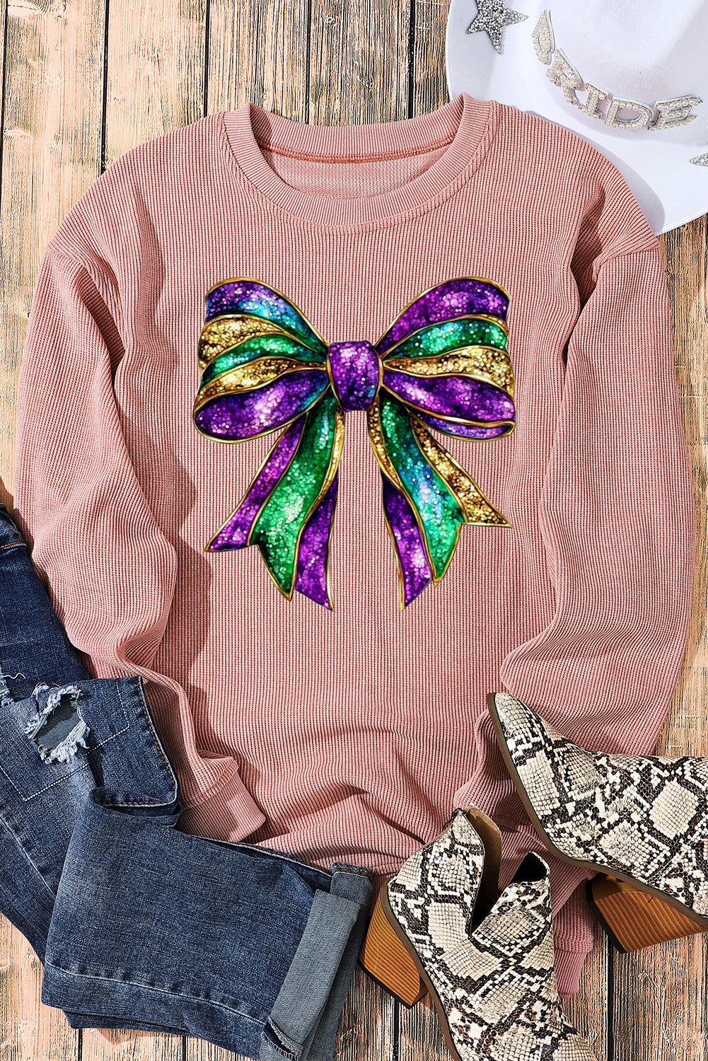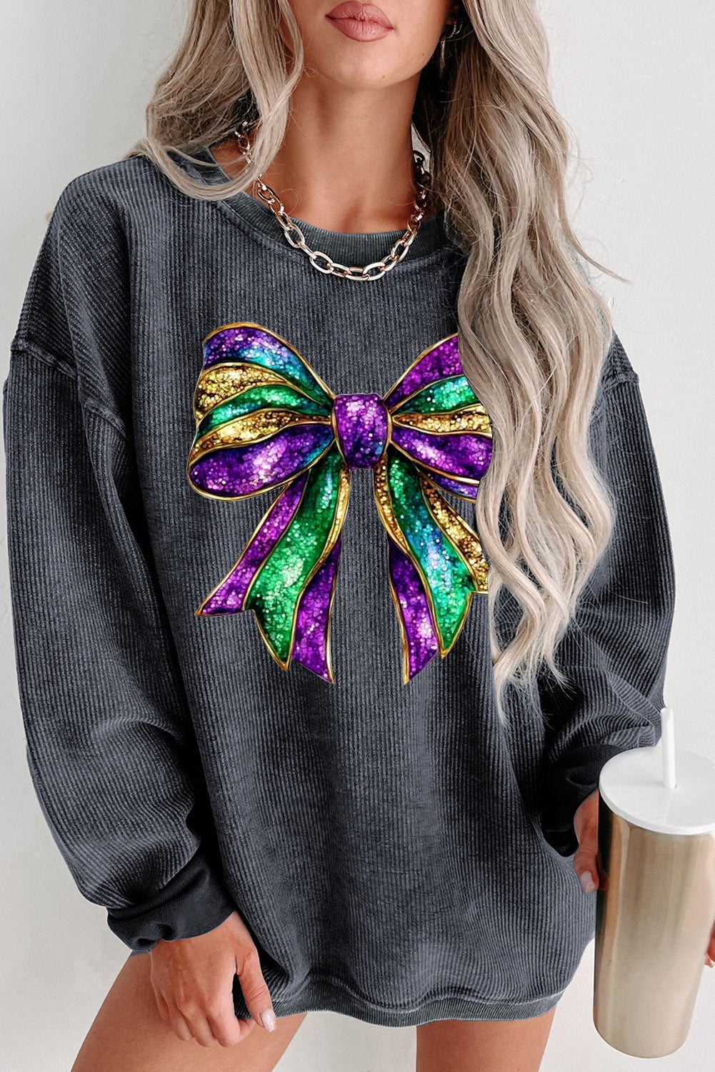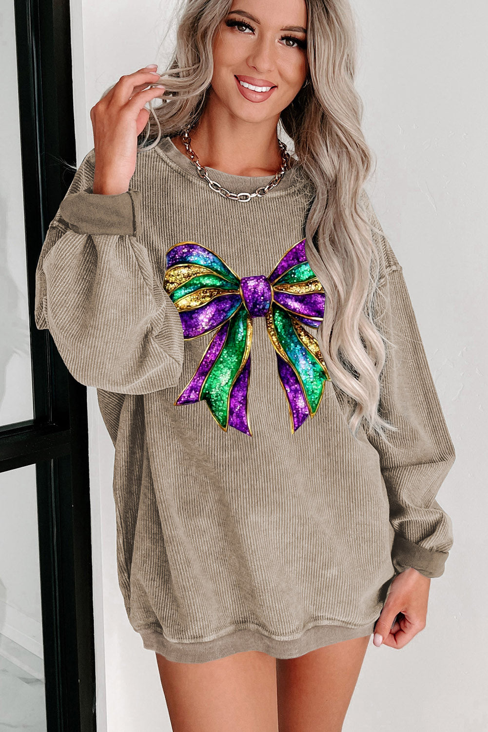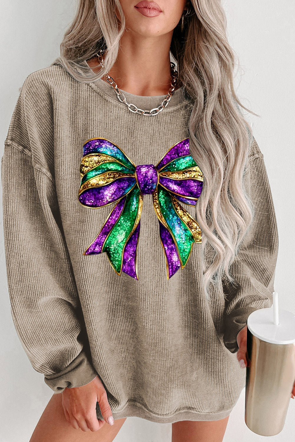 Mardi Gras Celebration Bow Print Oversized Knit Sweatshirt
