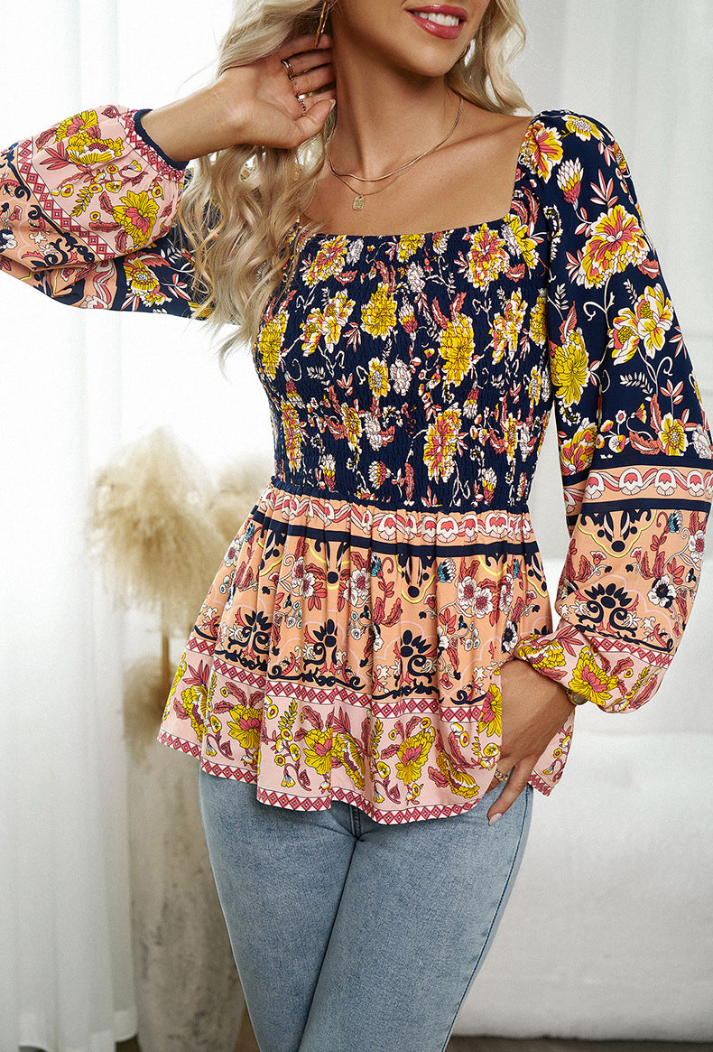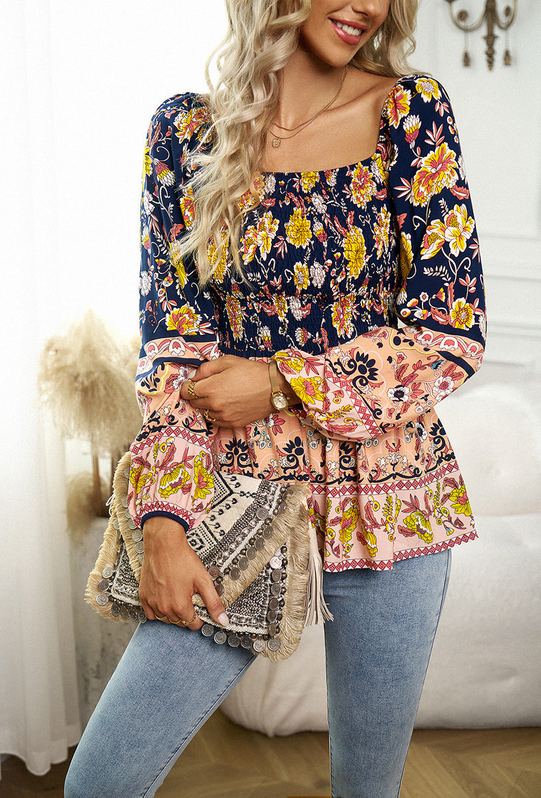 Navy Square Neck Off-Shoulder Bohemia Long-Sleeved Top