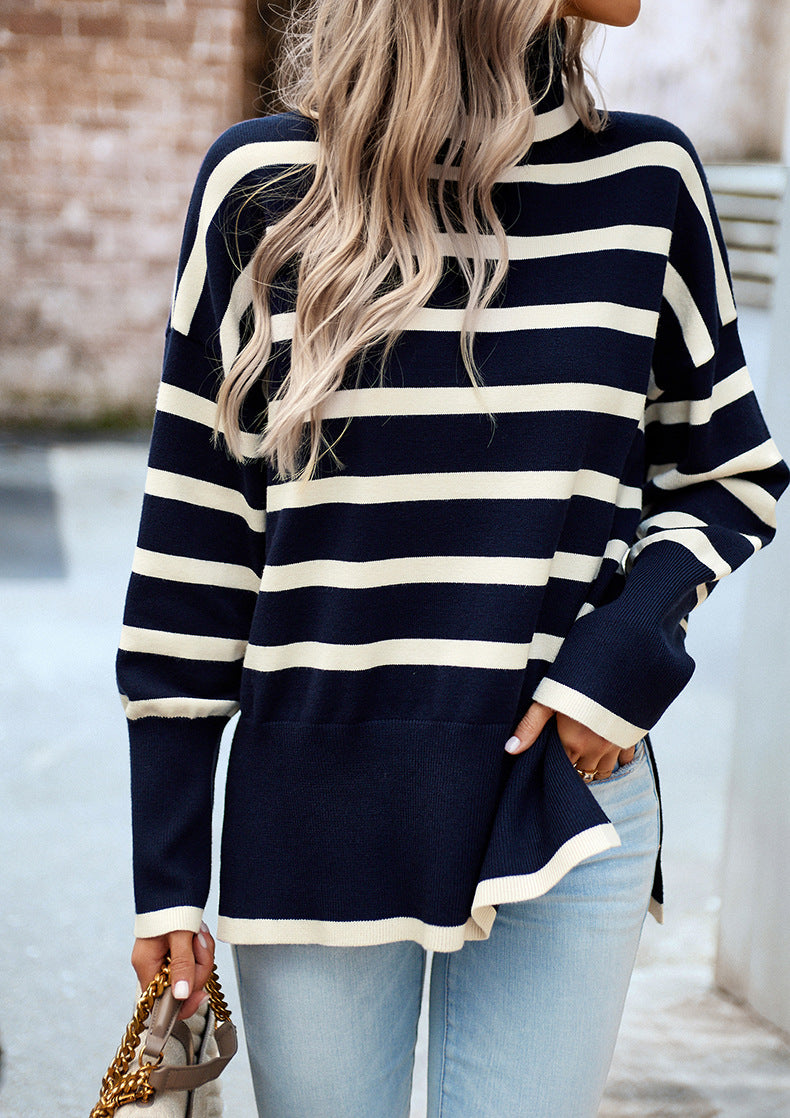 Navy Blue Turtleneck Striped Long Sleeve Knitted Pullover