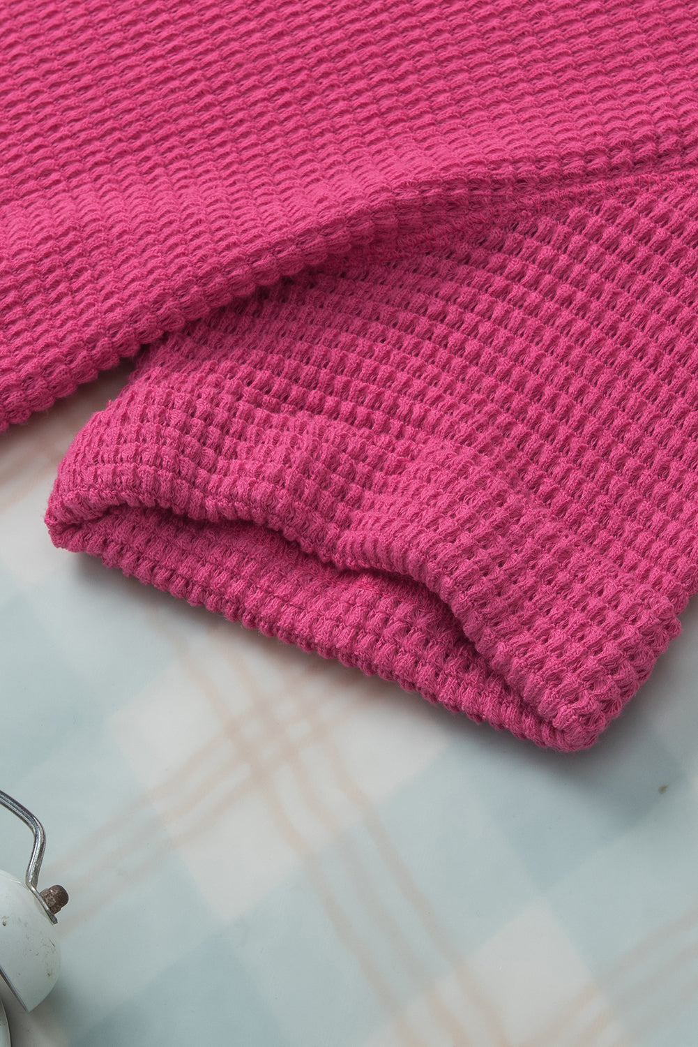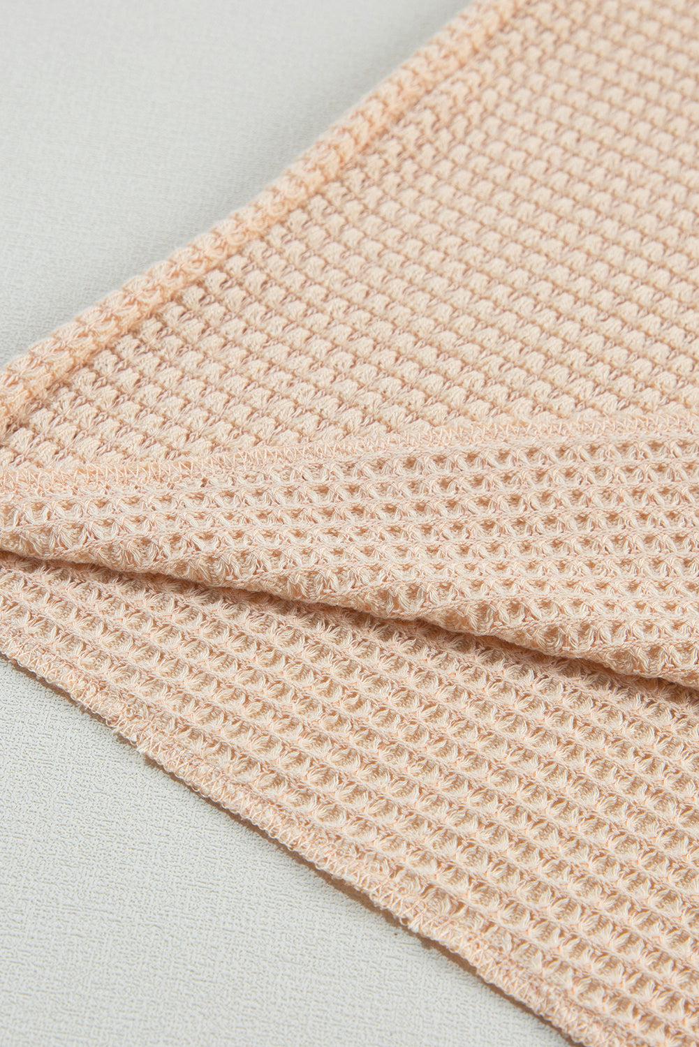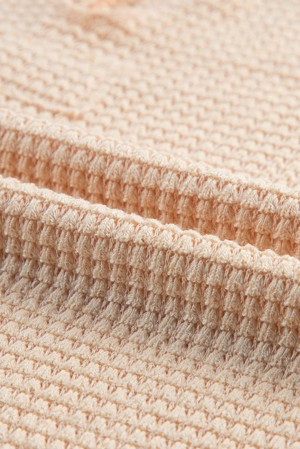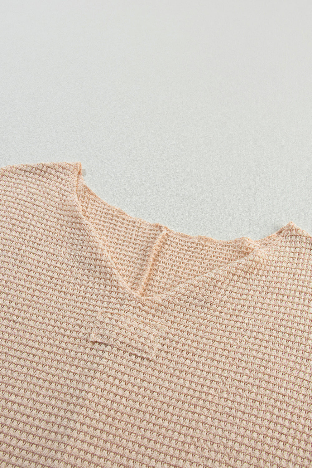 Parchment Textured Knit Split Neck Cuffed Short Sleeve Top