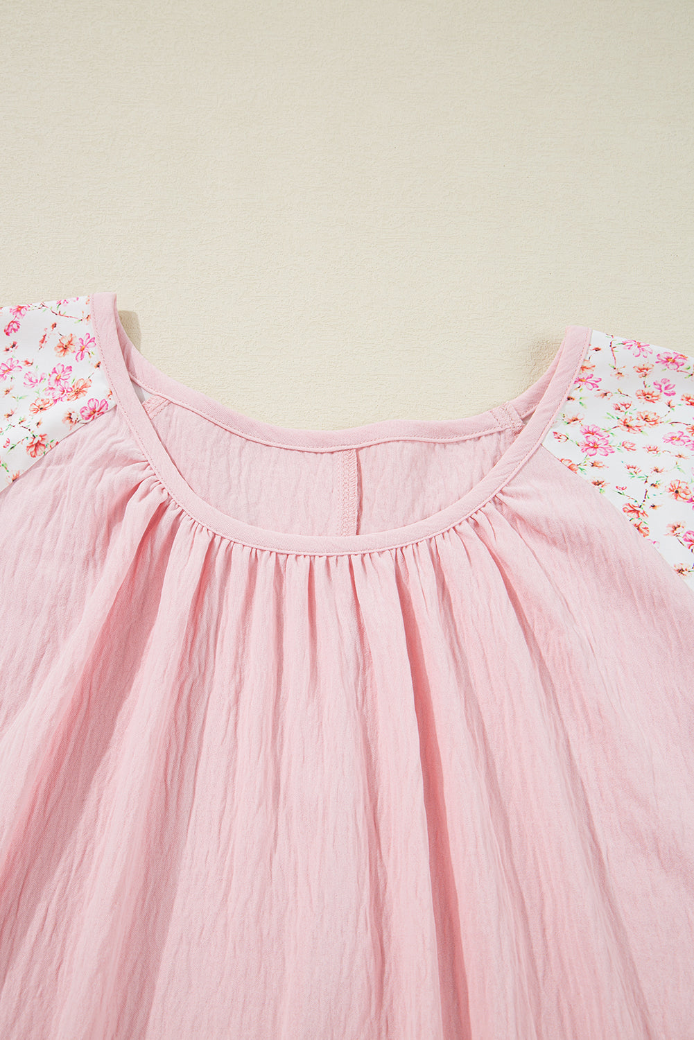 Pink Contrast Floral Patchwork Long Sleeve Plus Size Blouse