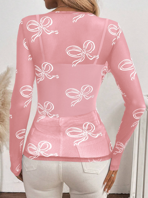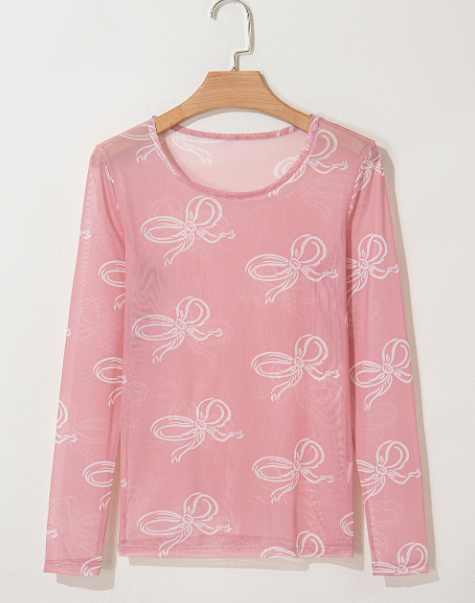 Black Round Neck Bow Print Long Sleeve Mesh Top