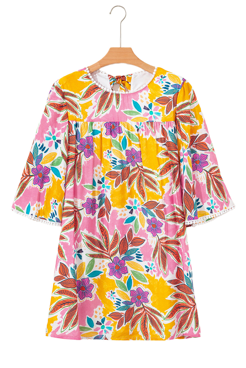 Pink Floral Print Lace Trimmed Tie Back Bell Sleeve Swing Mini Dress