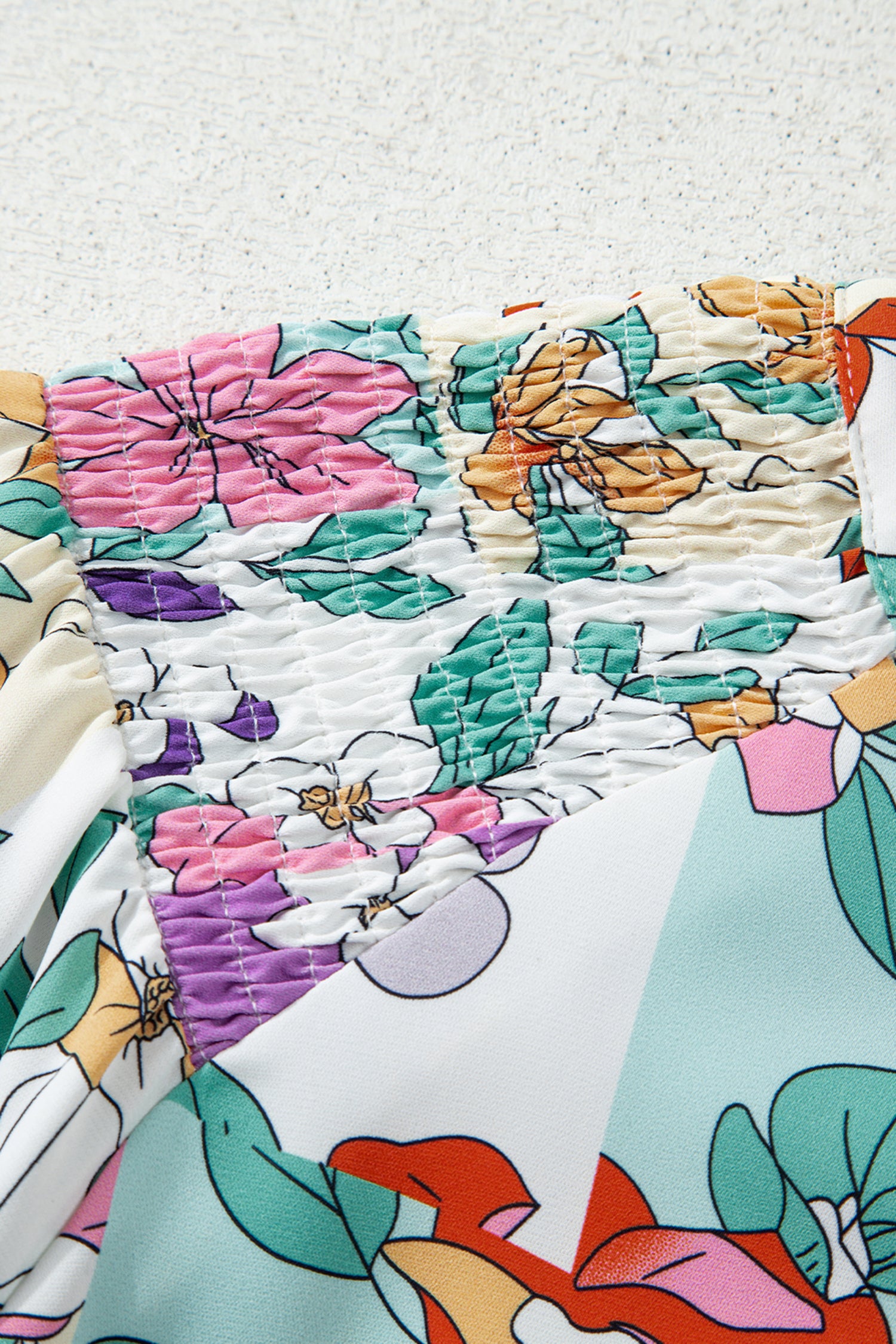 Pink Floral Print Patchwork Frilly Neckline Long Sleeve Shirt