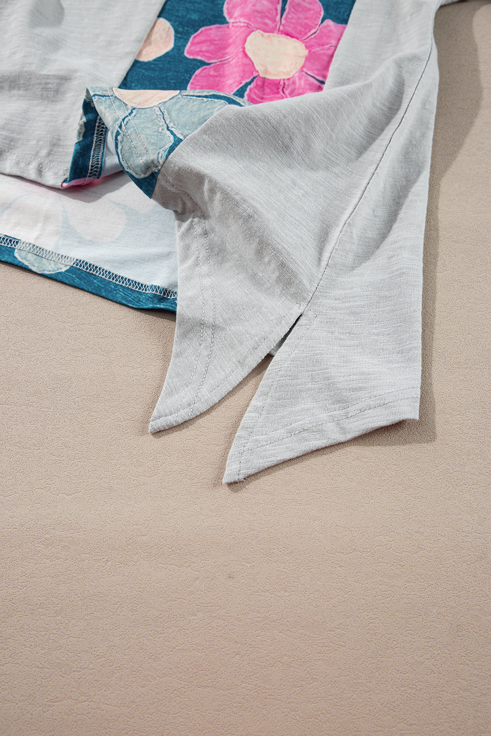 Pink Flower Patchwork Exposed Seam Oversized High Low Top
