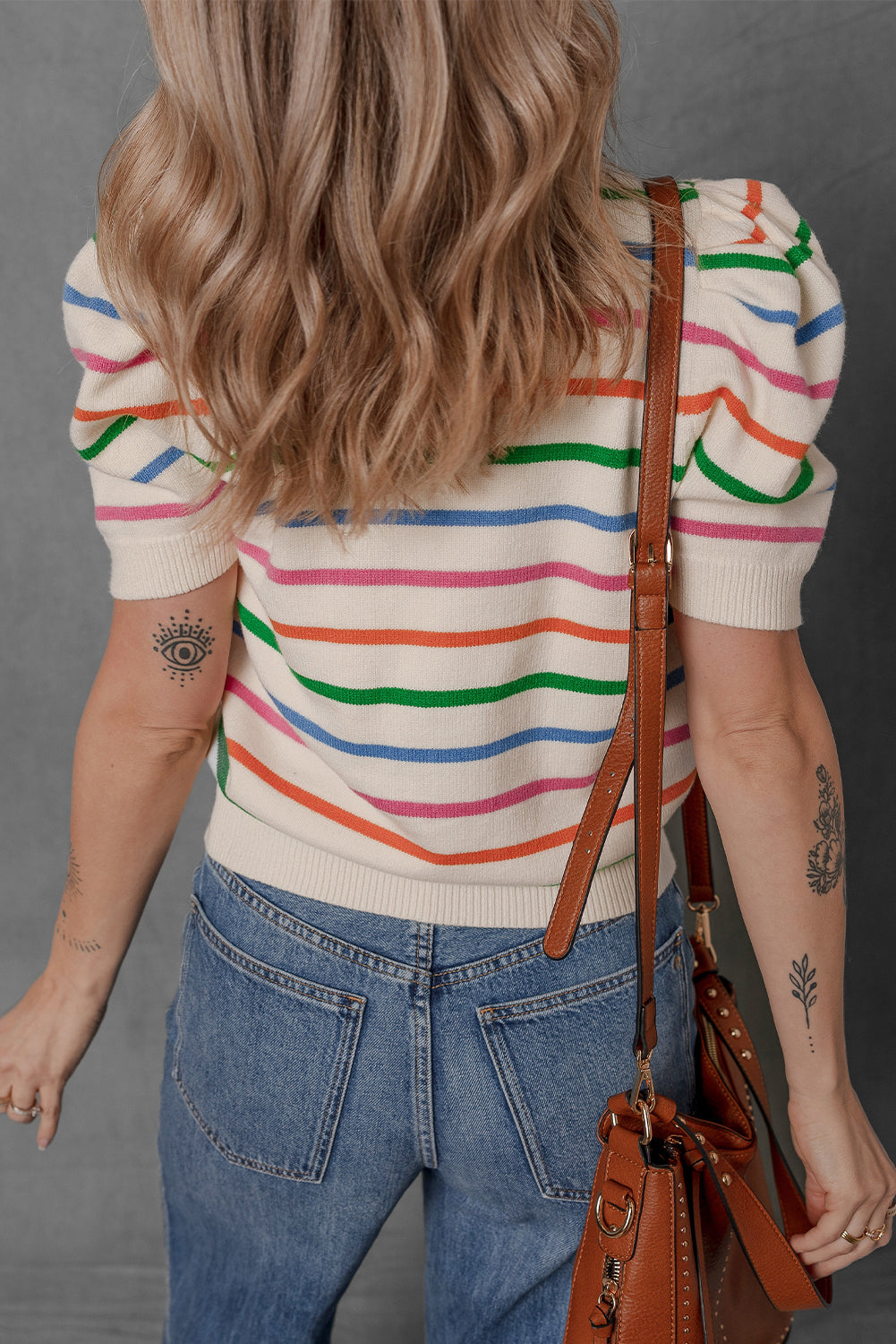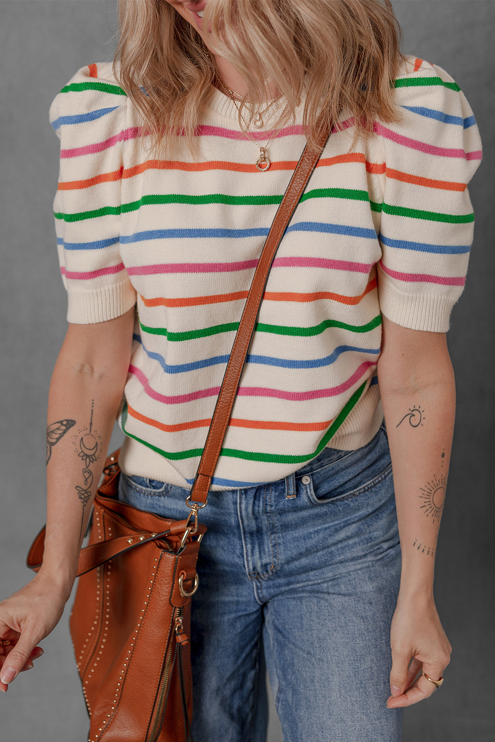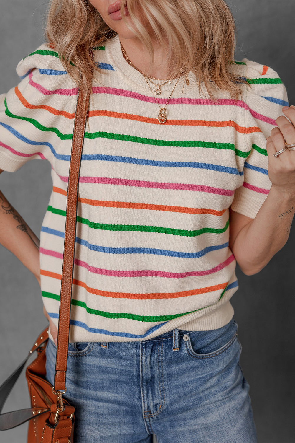 - Brighten up your wardrobe with this rainbow colorblock bubble sleeve round neck sweater.
