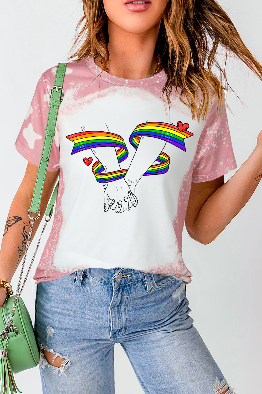 Celebrate unity and positivity with a vibrant rainbow print and hand-holding design. This graphic tee speaks volumes with style and heart, making it a standout piece.