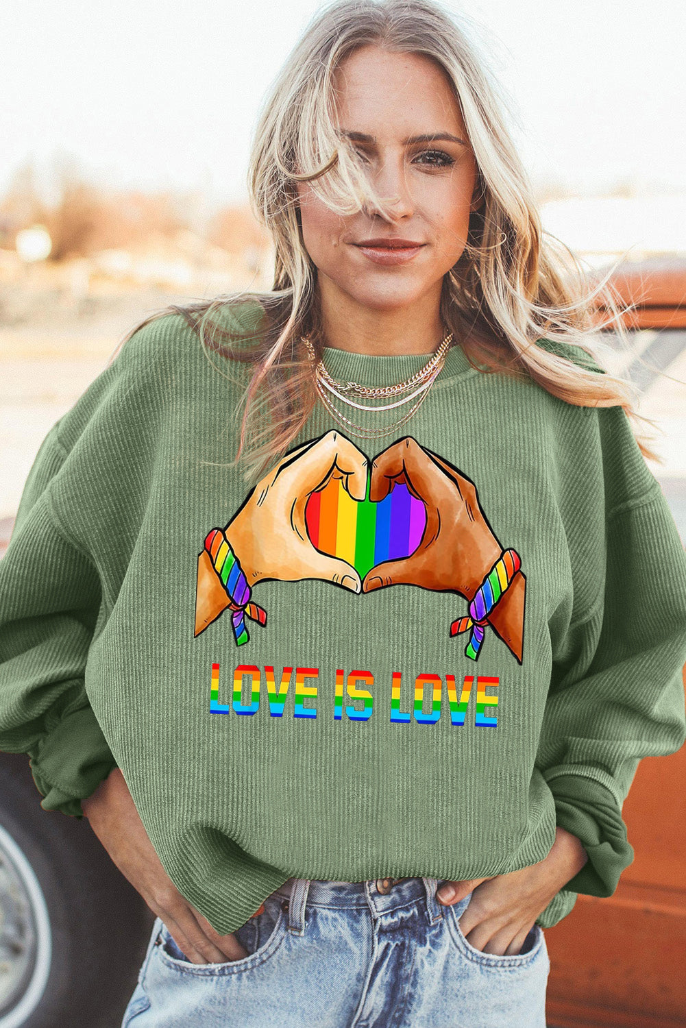 The soft corded fabric, paired with bold, colorful lettering, radiates love, inclusivity, and pride.