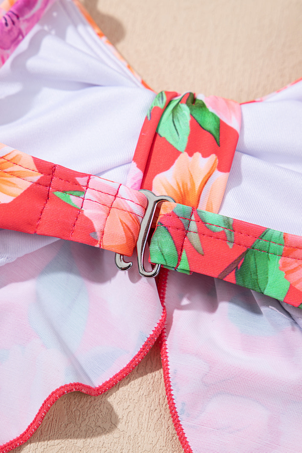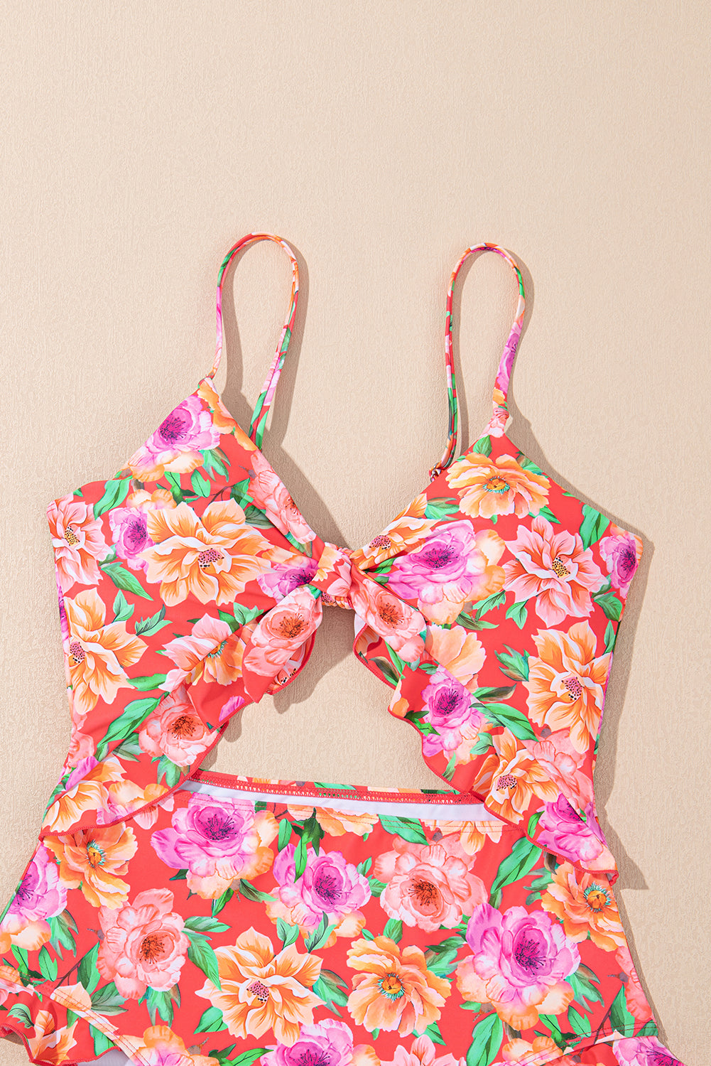 Red Floral Ruffle Trim Cutout Knotted One Piece Swimsuit