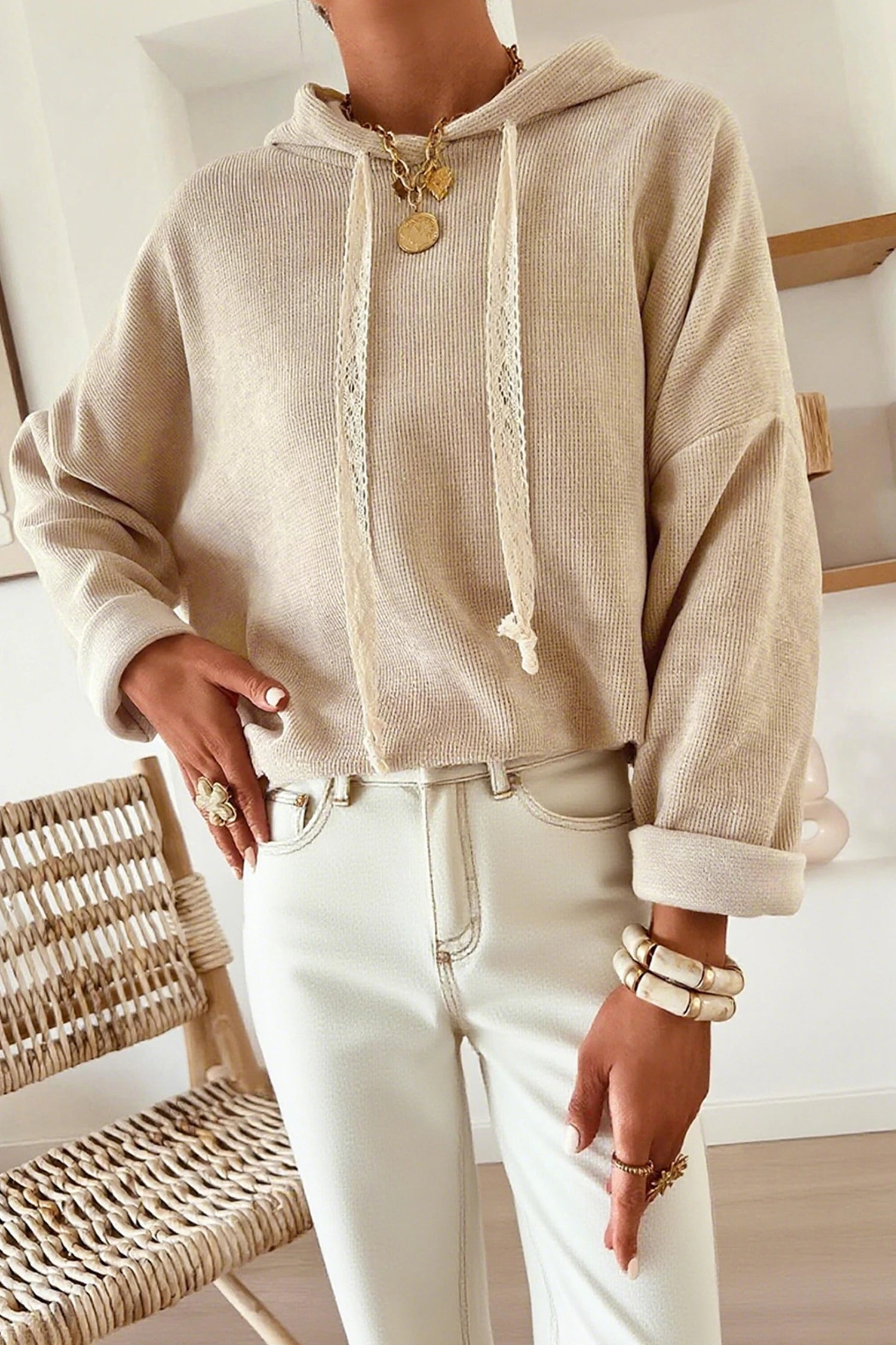 Rose Tan Thermal Textured Lace Drawstring Baggy Hoodie