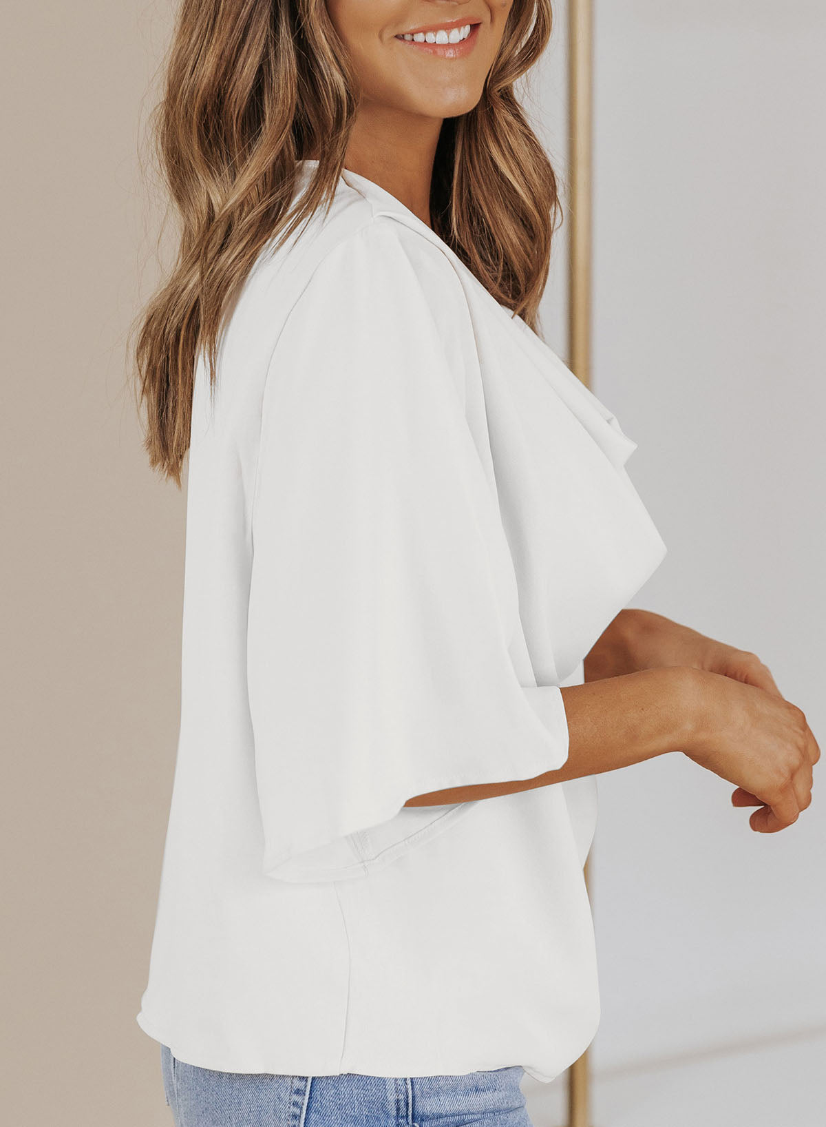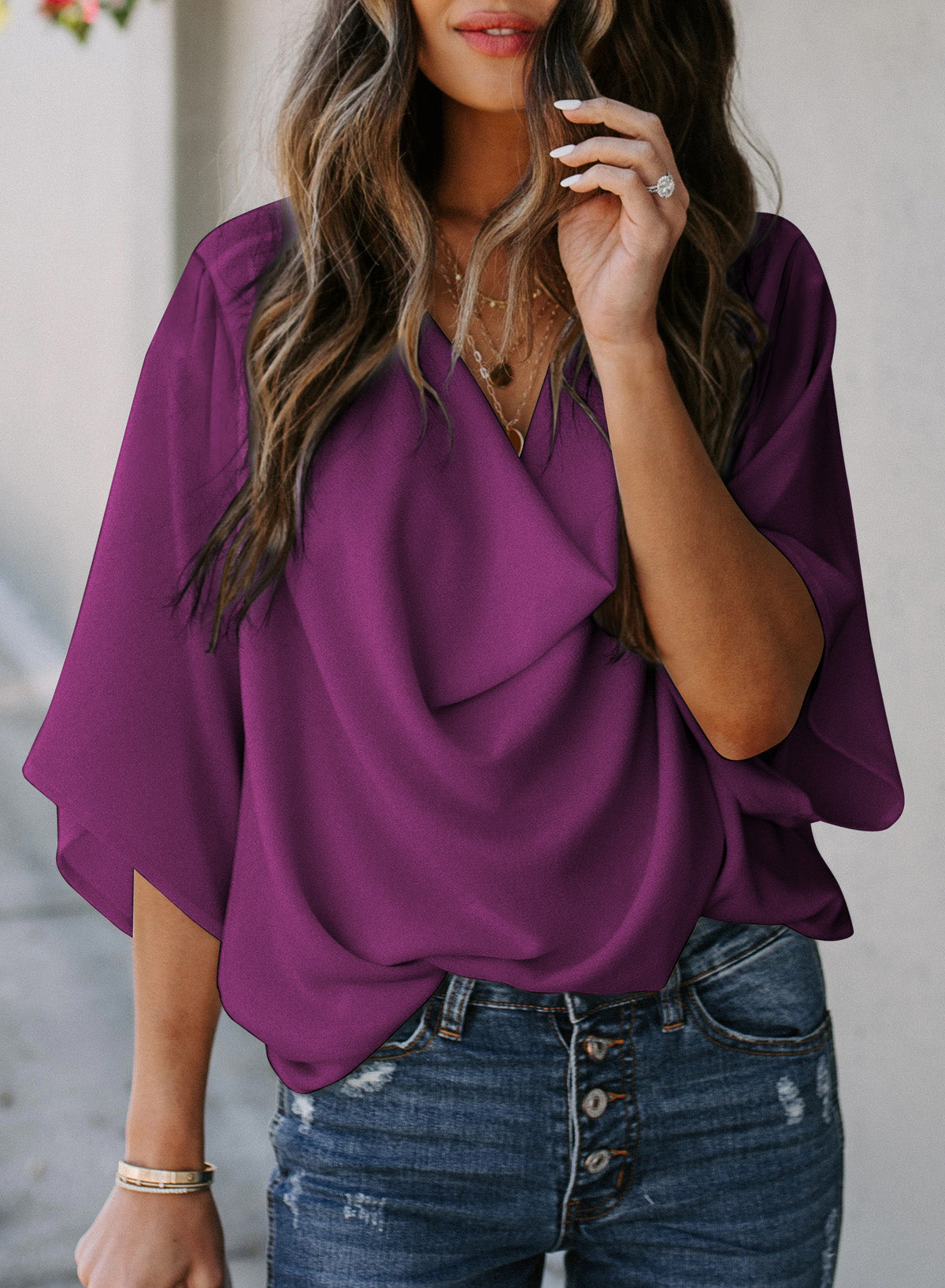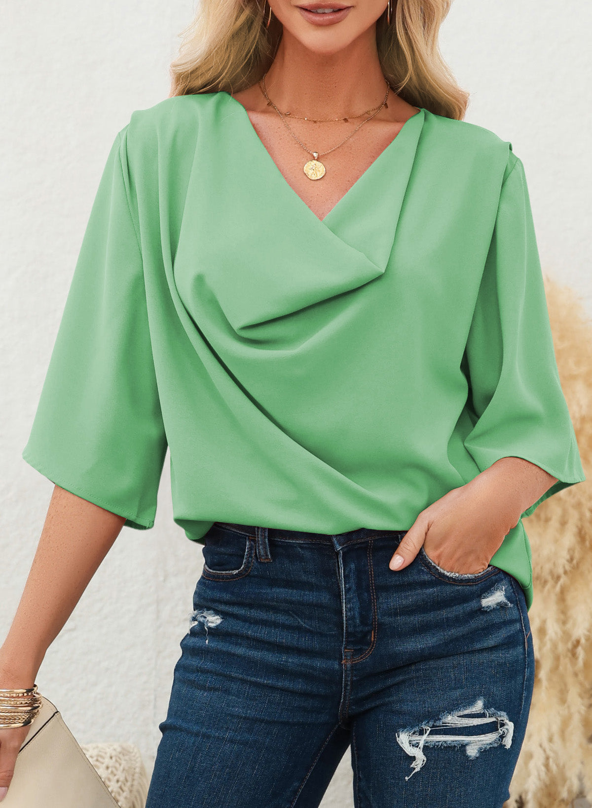 •The ladies tops graceful half sleeves and excellent fabric is transitional and lightweight for seasons to come