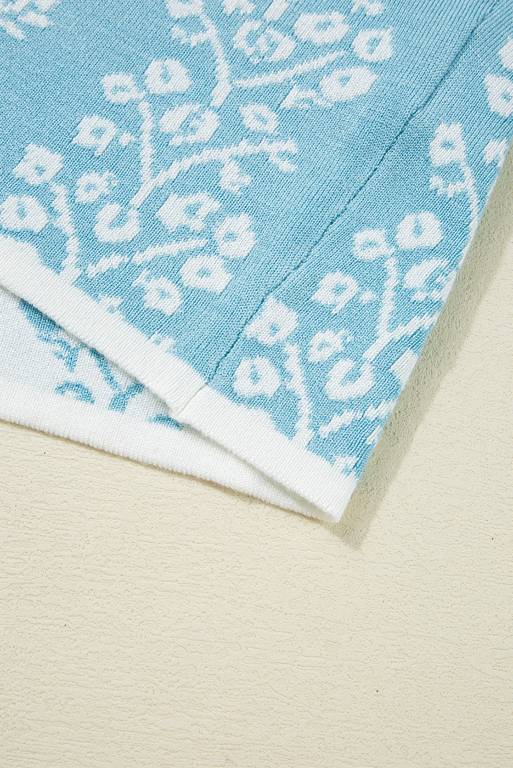 Sky Blue Contrast Floral Crewneck Short Sleeve Sweater