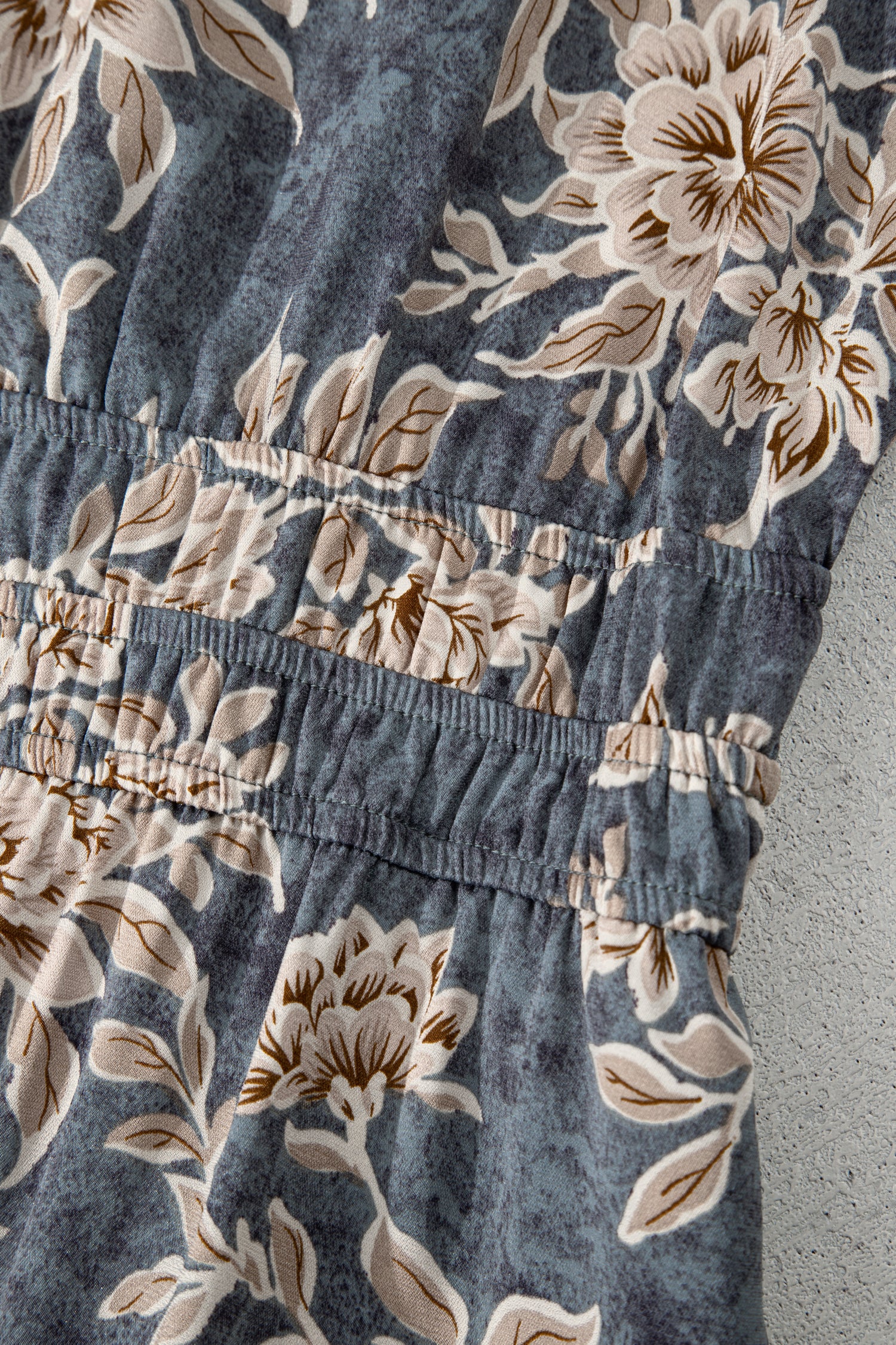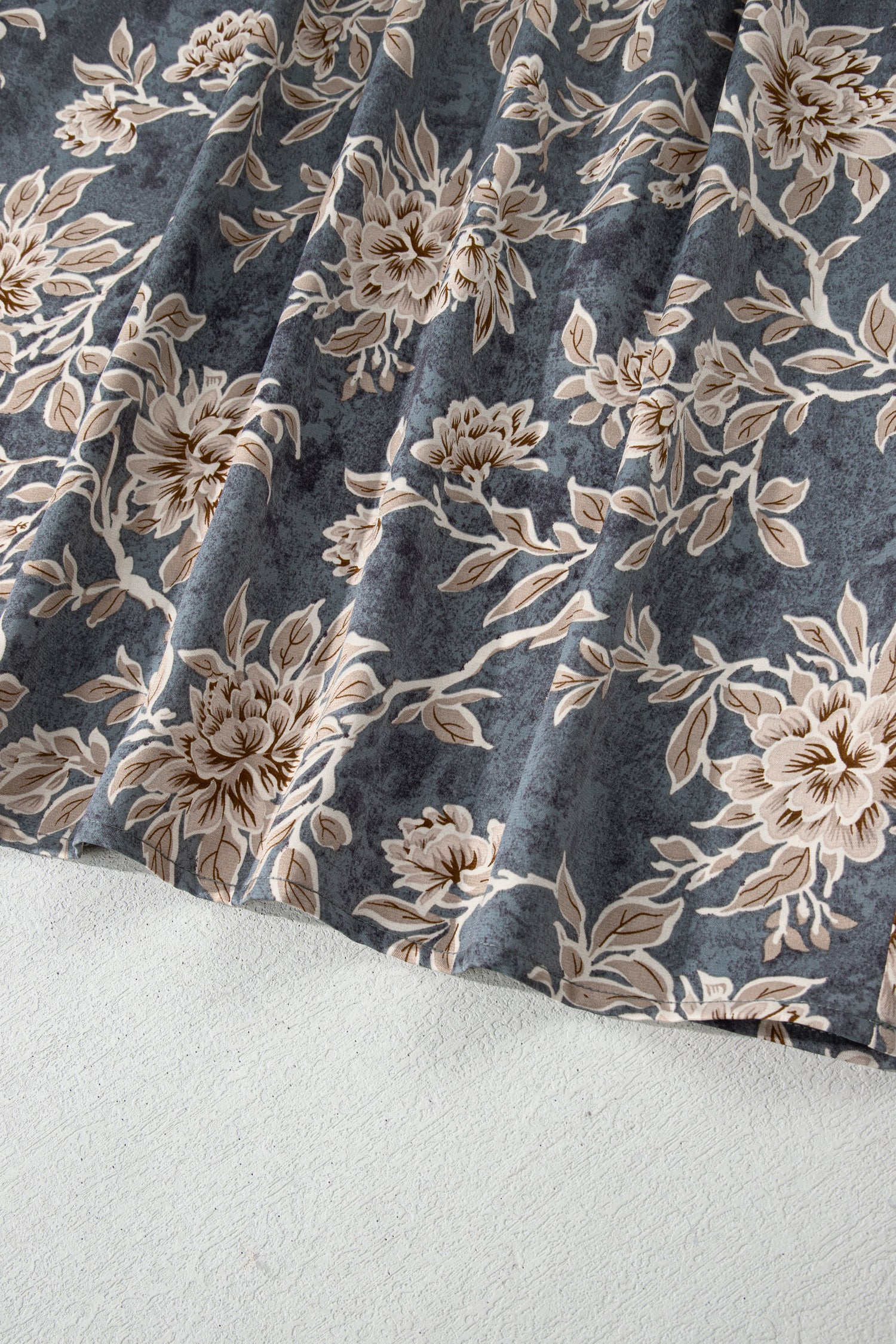 Sky Blue Plus Size Floral Print Split Neck Shirred High Waist Long Sleeve Maxi Dress