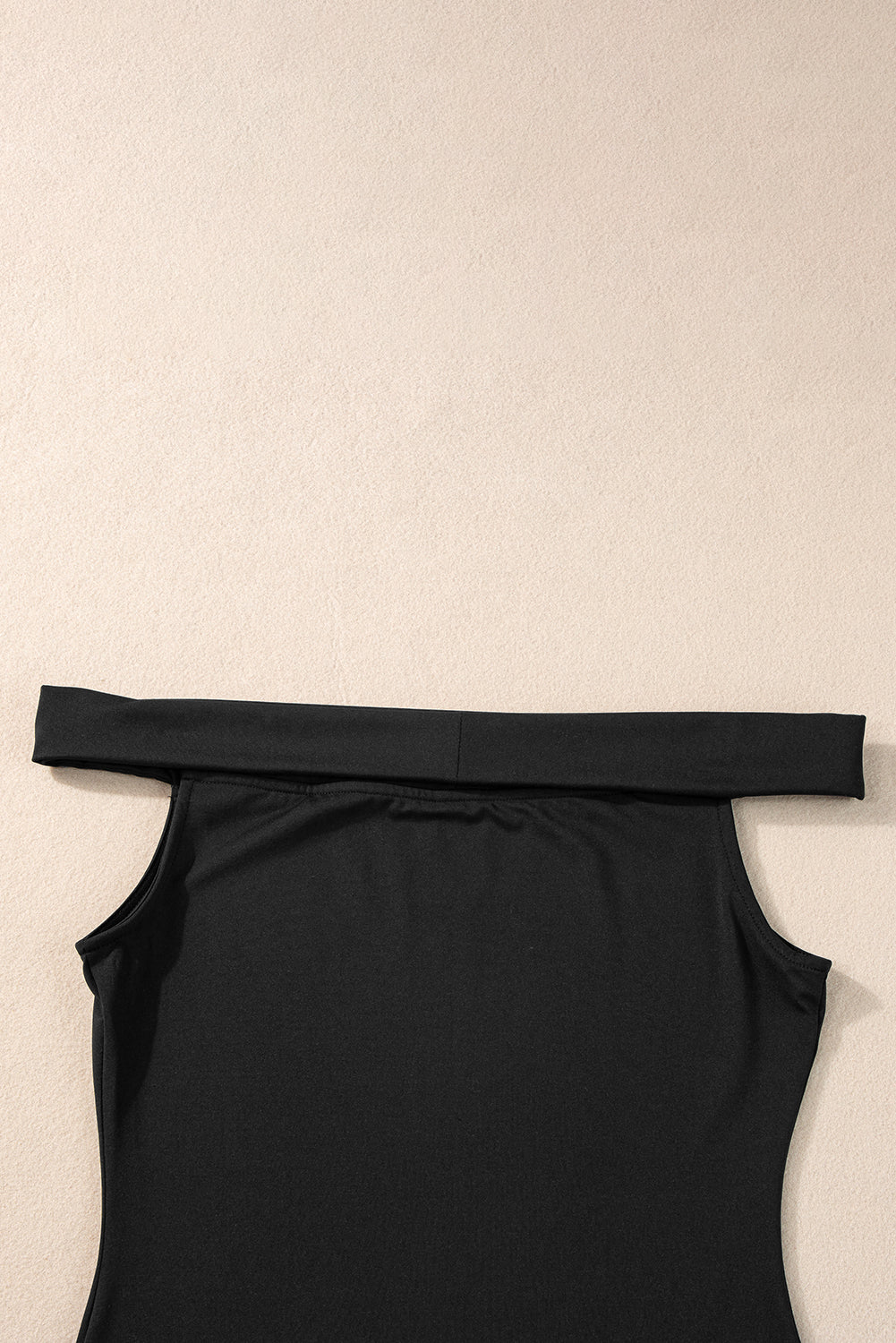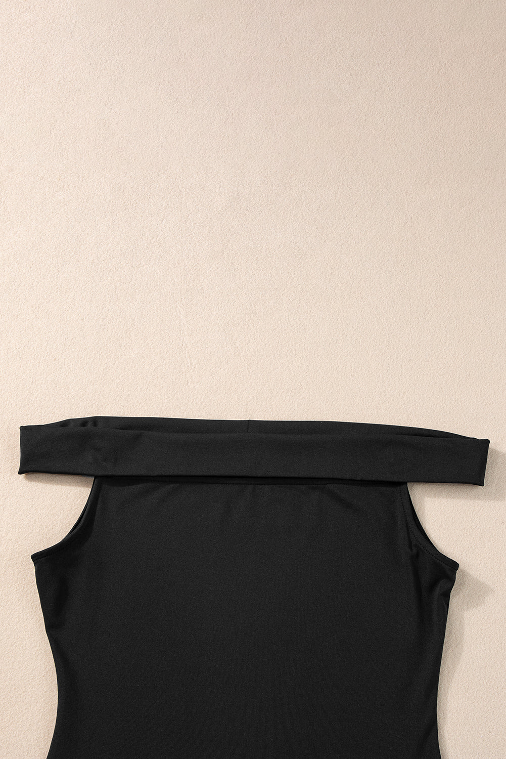 The slim silhouette accentuates your figure while the off-shoulder adds a touch of elegance