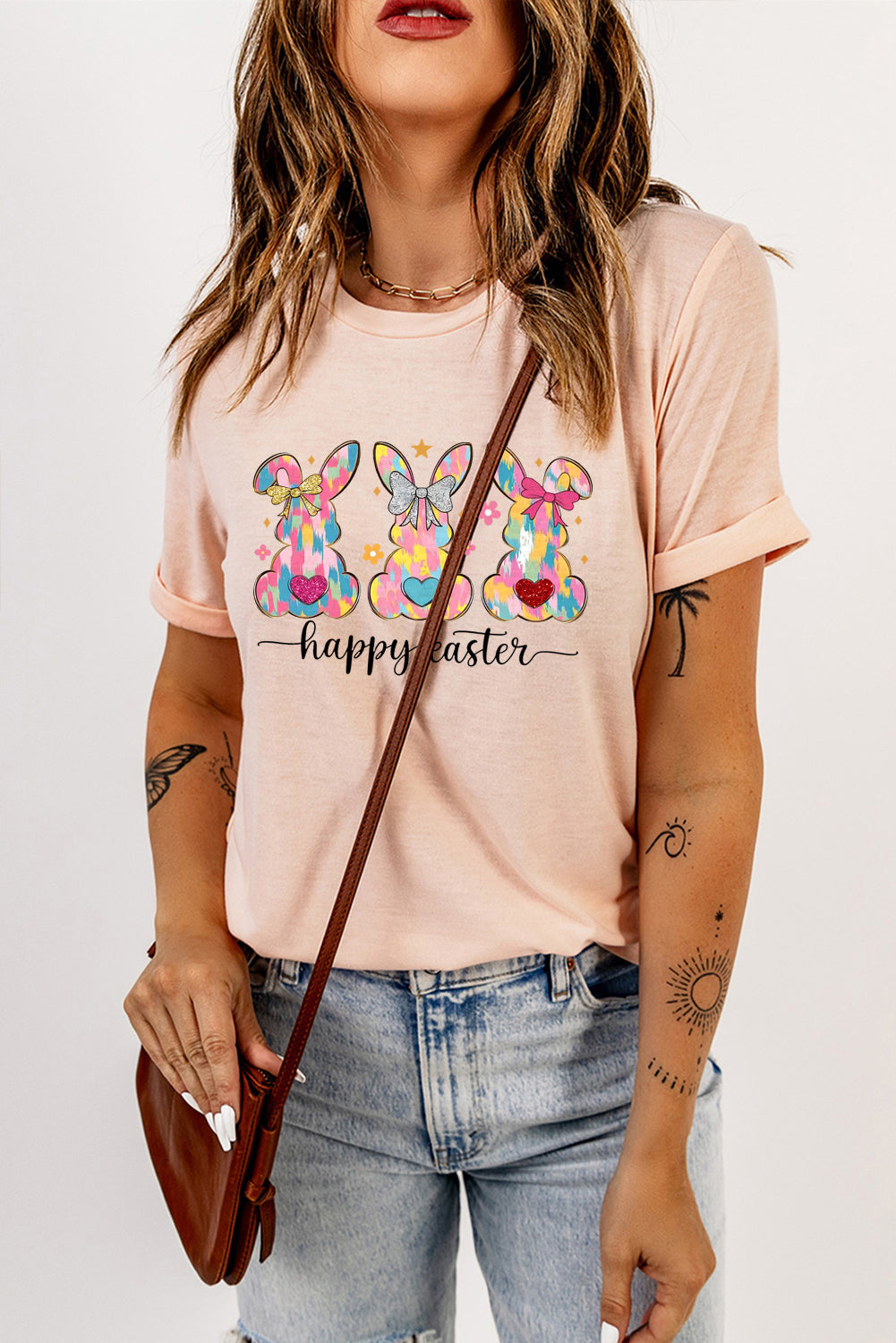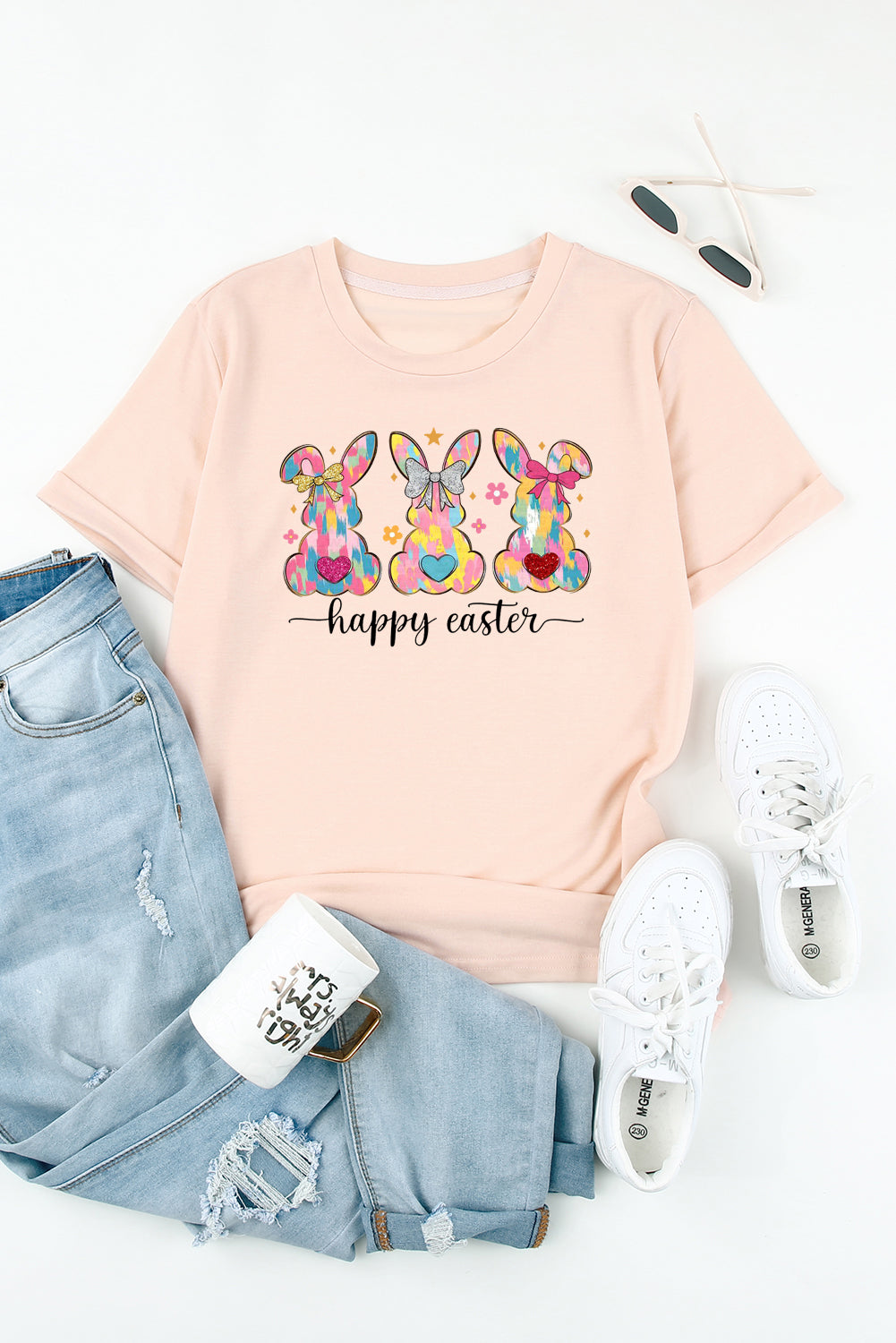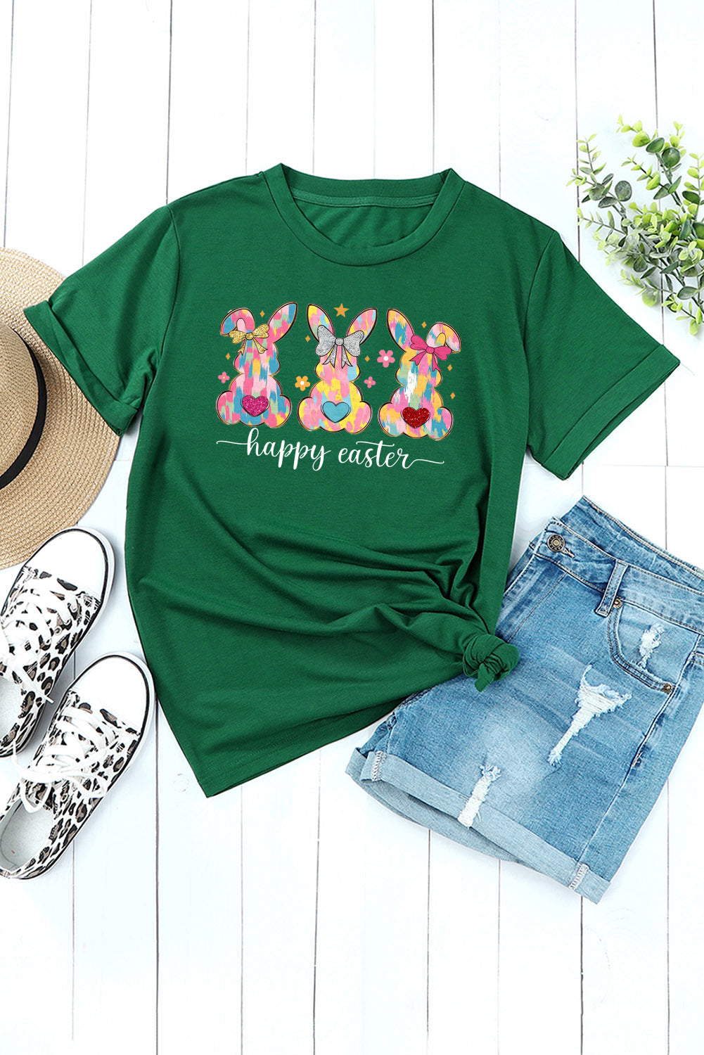 Solid Color Crew Neck T-Shirt with Easter Bunny Design
