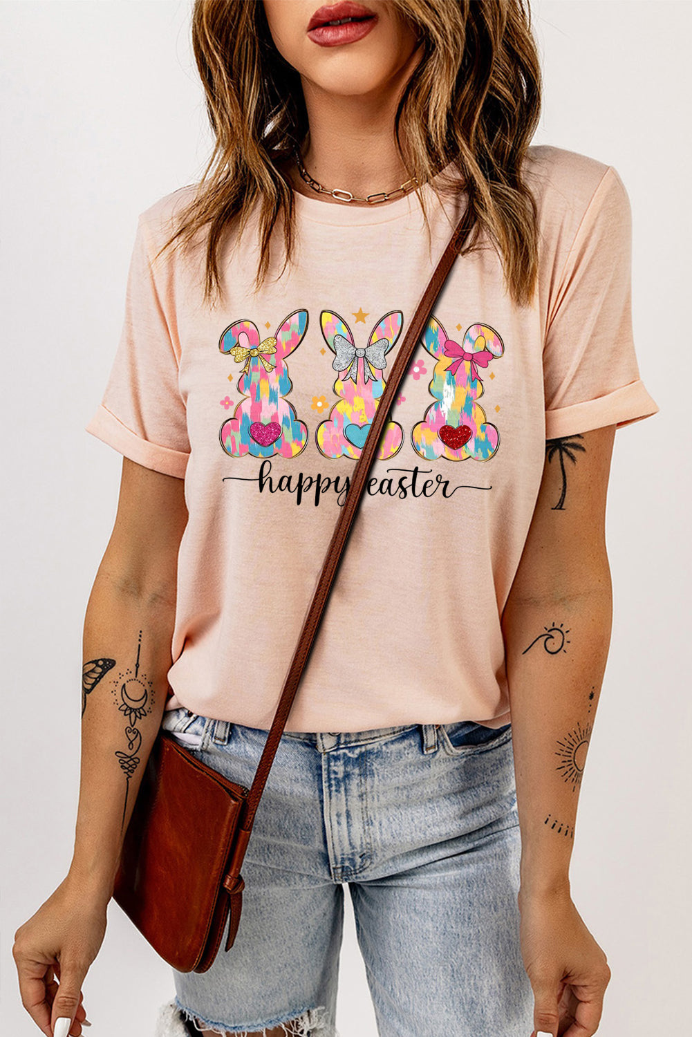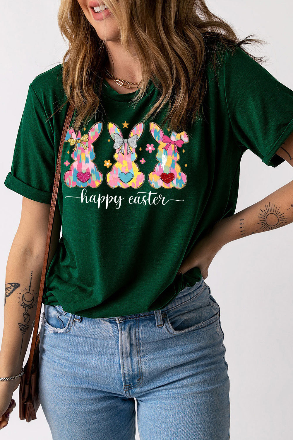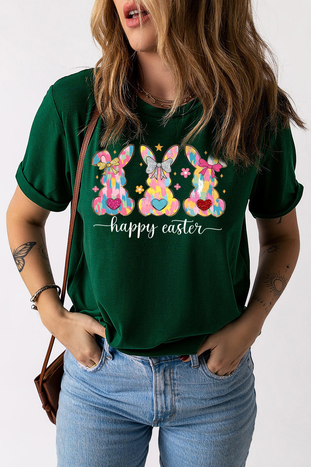 Solid Color Crew Neck T-Shirt with Easter Bunny Design