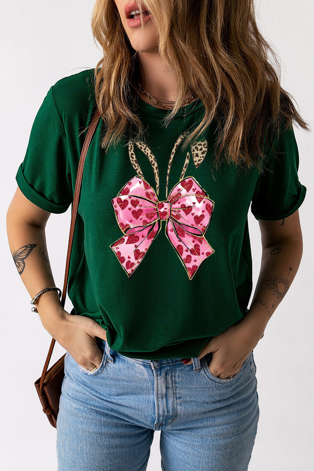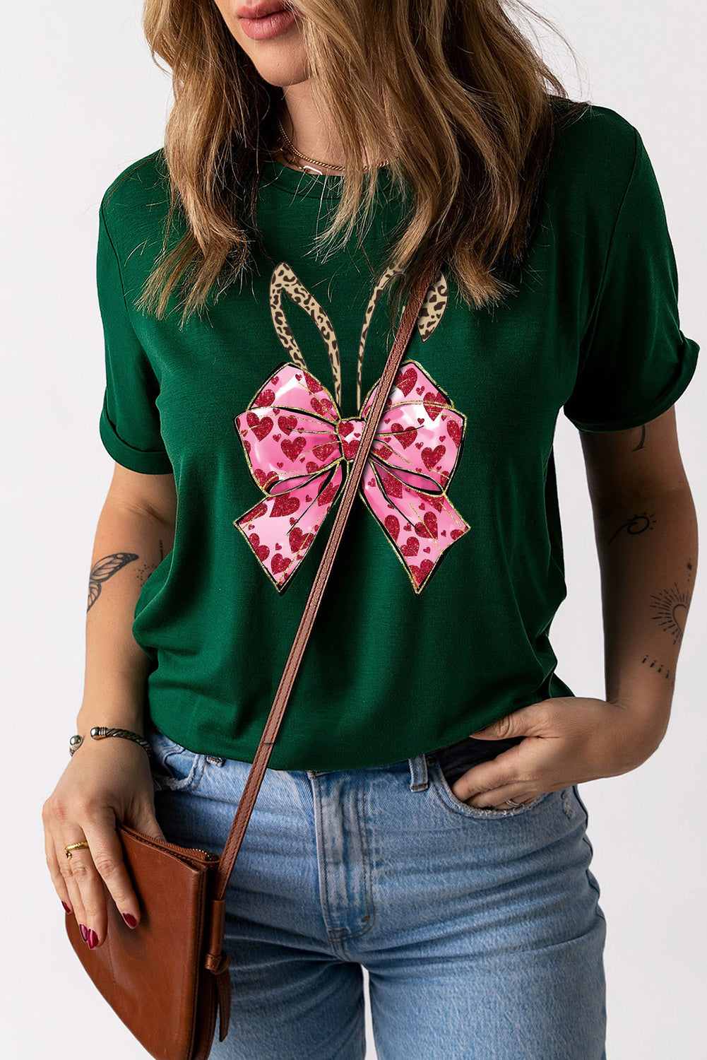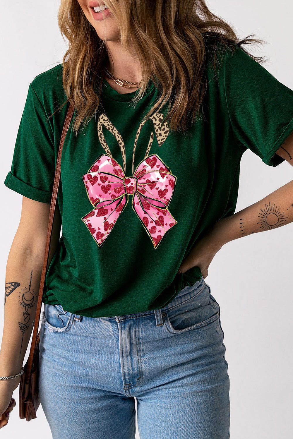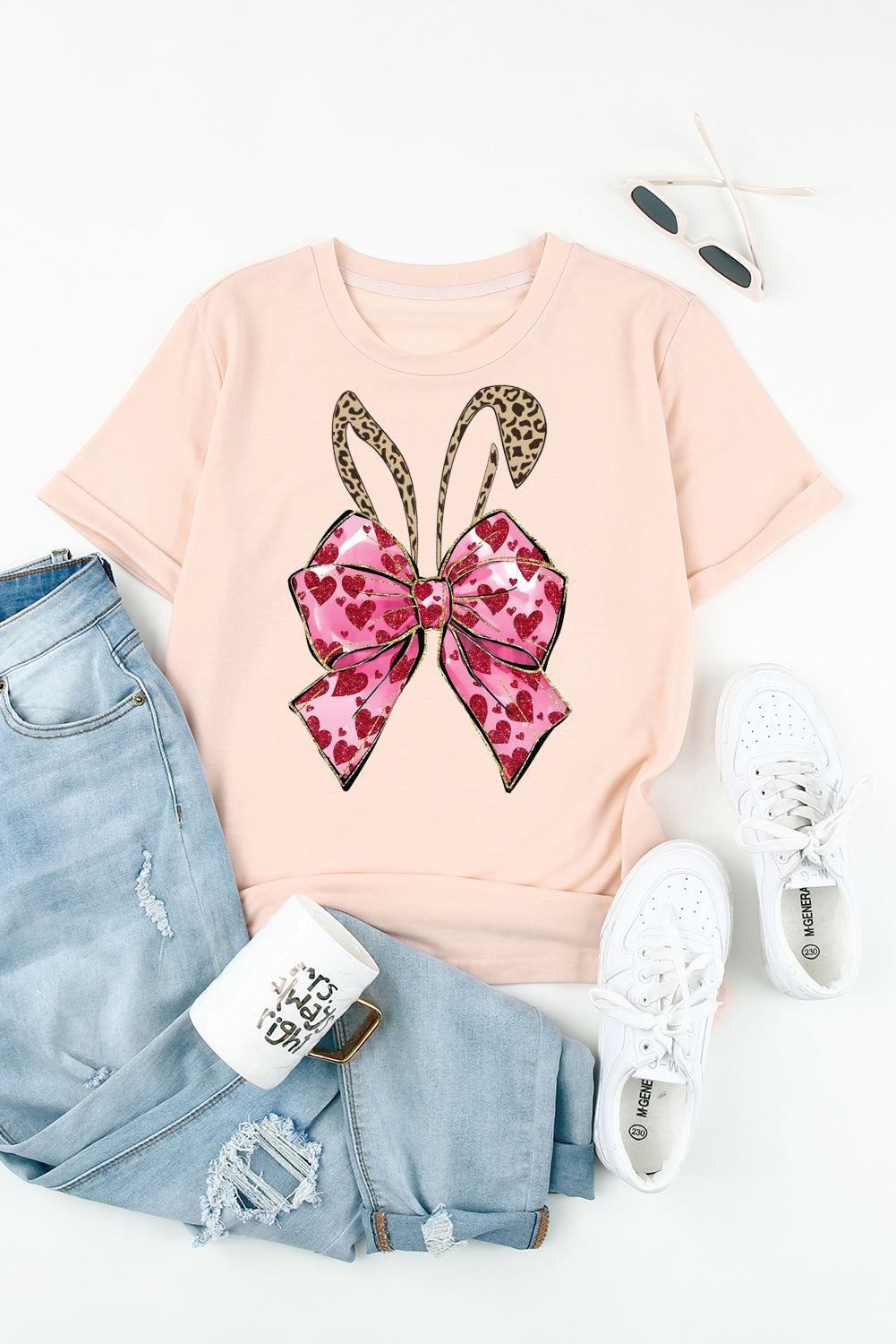 Solid Color Crew Neck Tee with Bowknot Bunny Ear Print for Easter