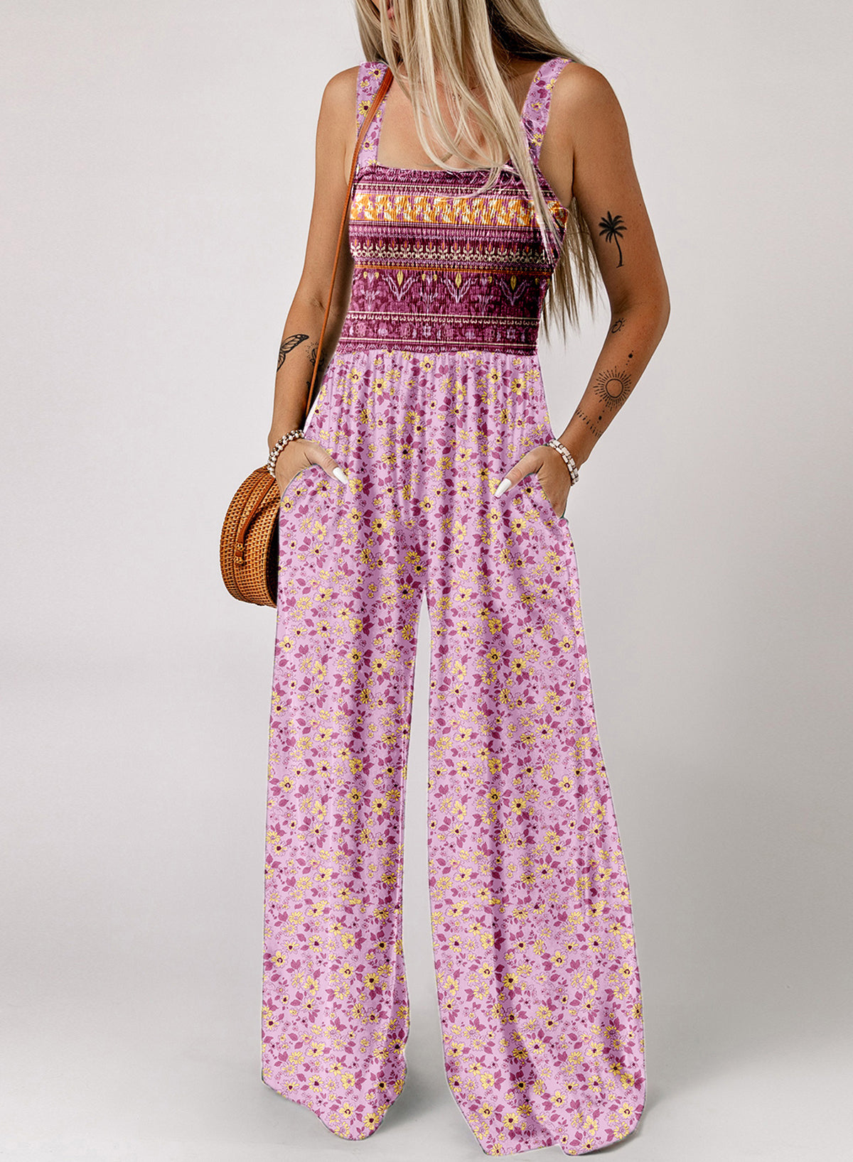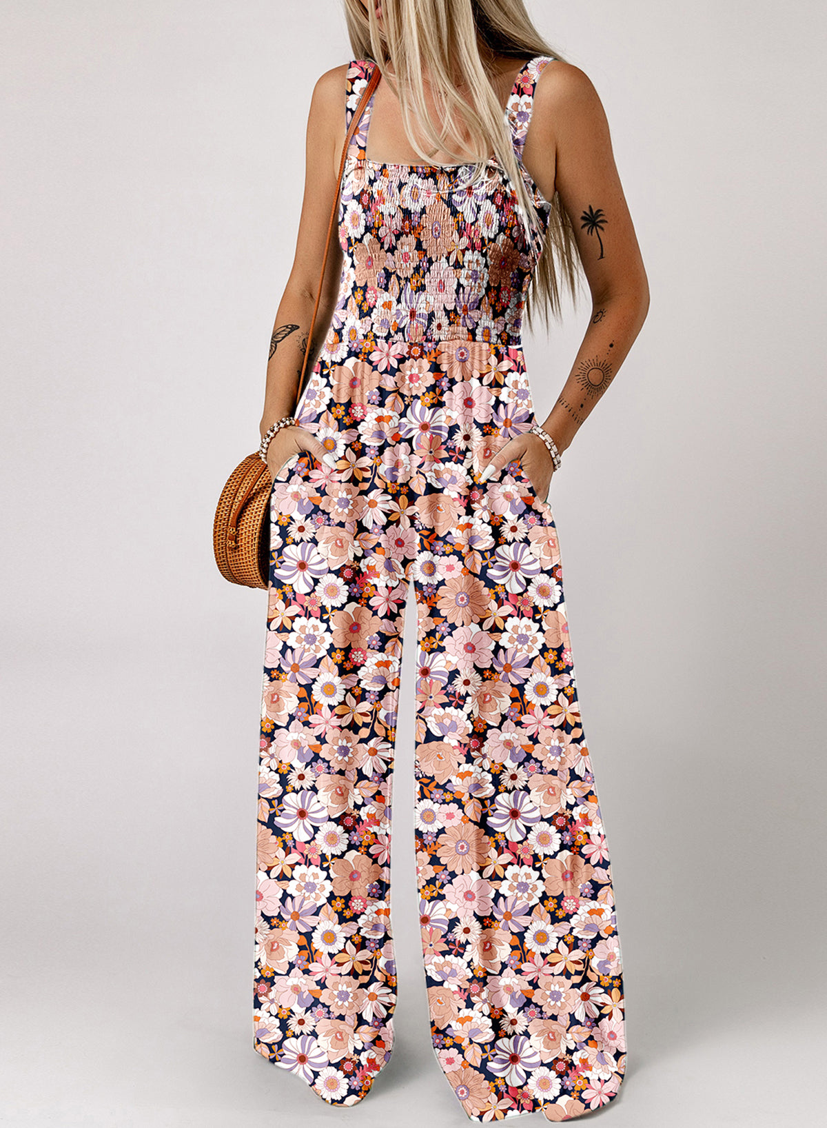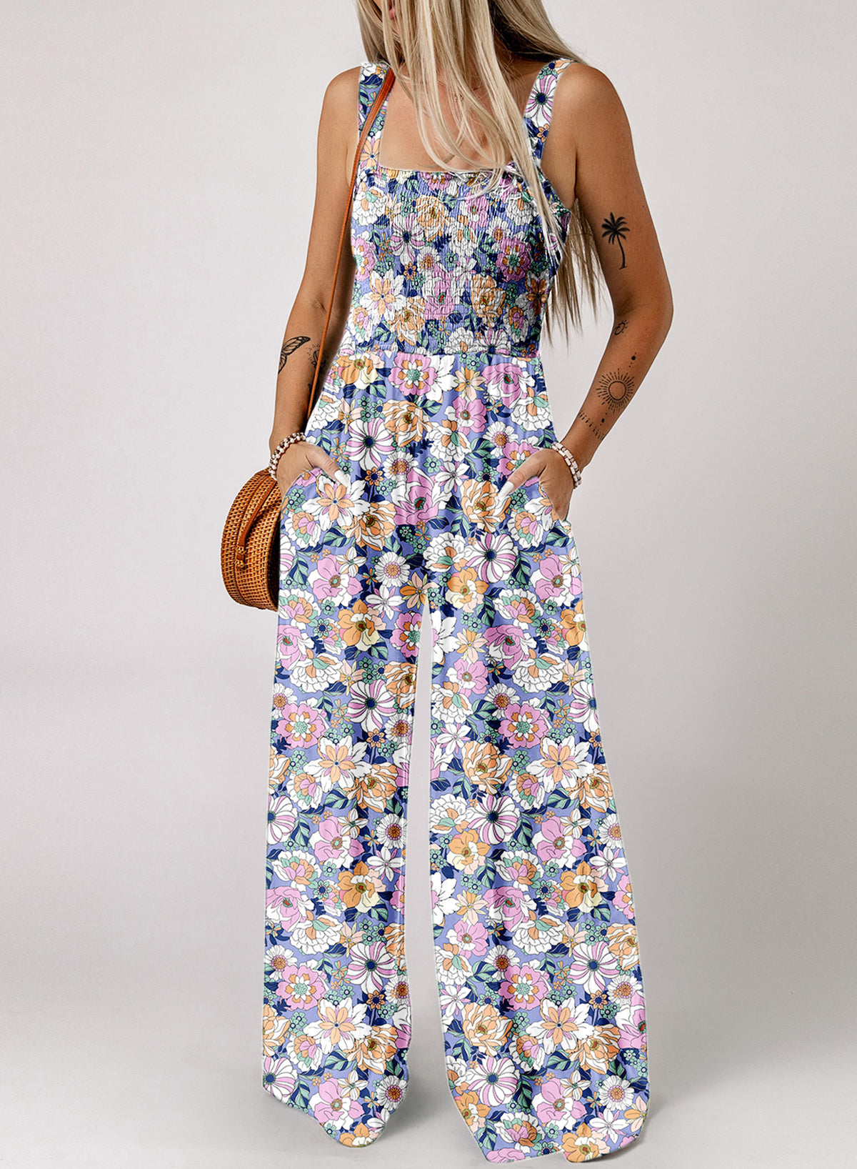 - Square Neckline Stretch Waistband Printed Jumpsuit