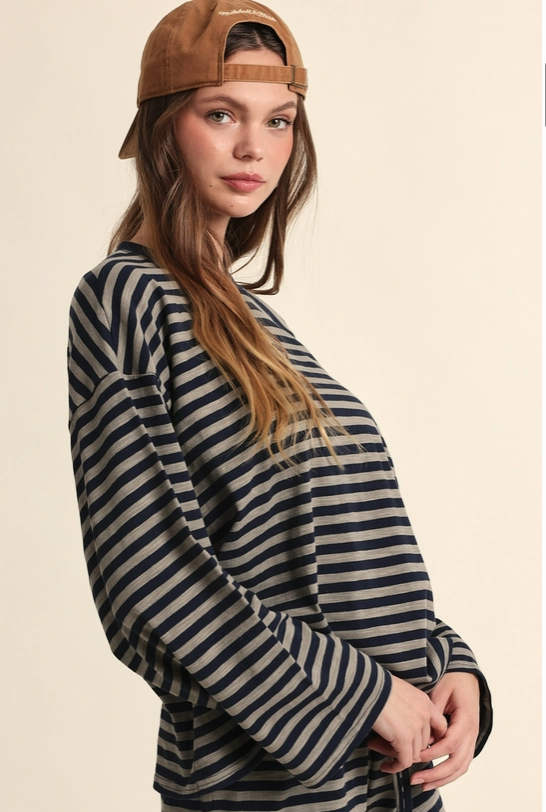 This striped lounge set blends casual comfort with effortless style, making it a great addition for boutiques looking for relaxed everyday pieces. The classic stripe pattern adds a timeless look that customers love for both lounging and casual outings.