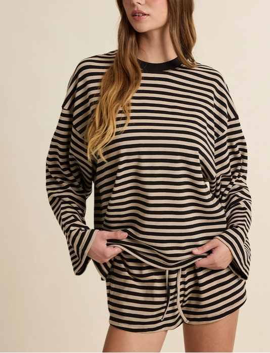 Striped Lounge Set Casual Long Sleeve Top Shorts