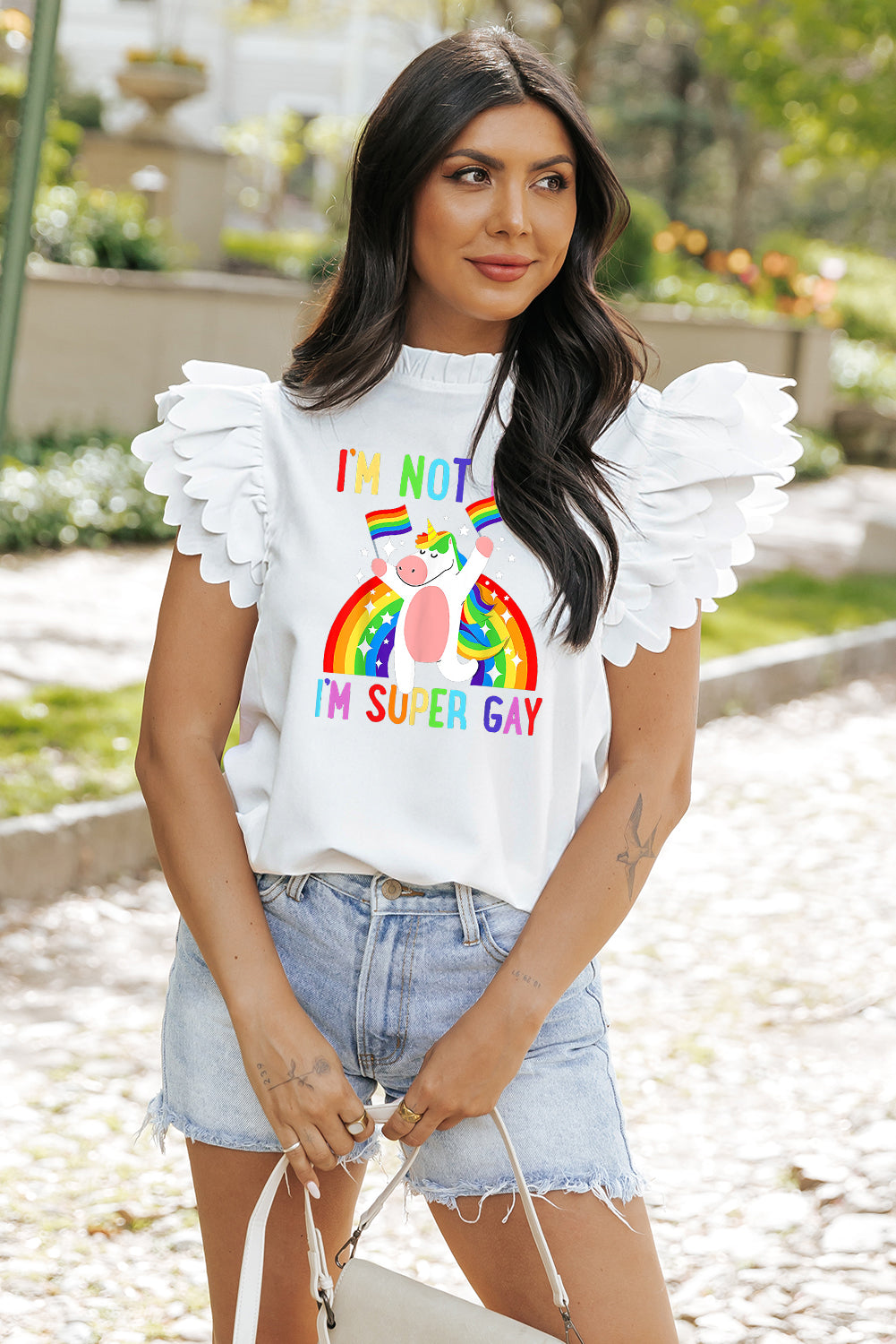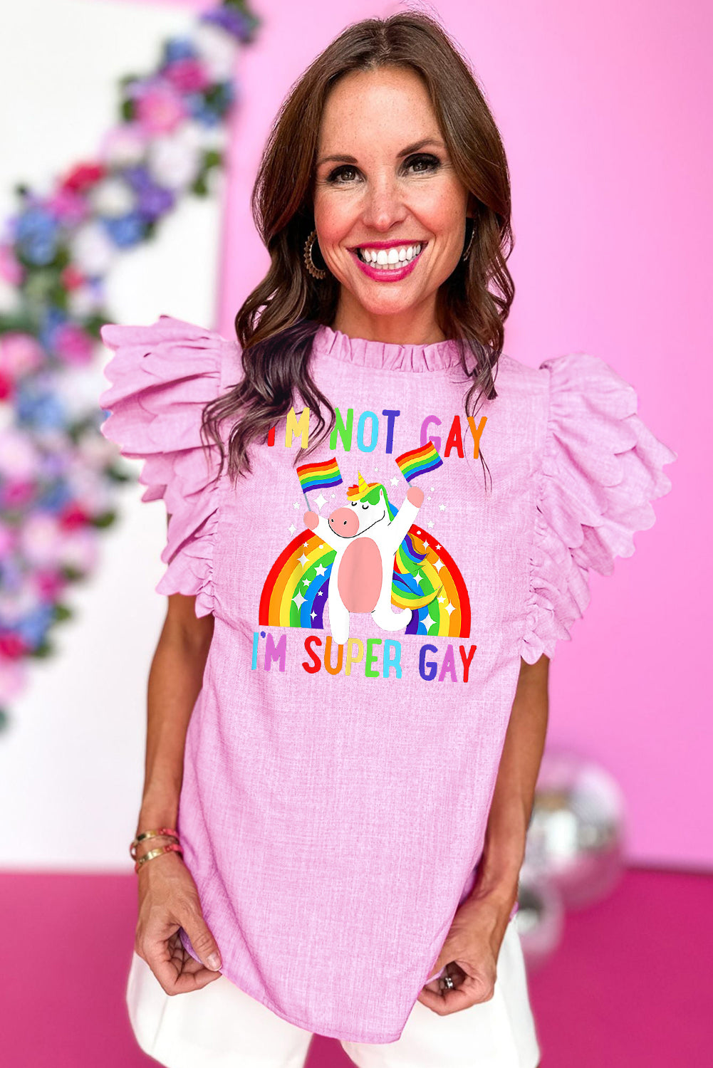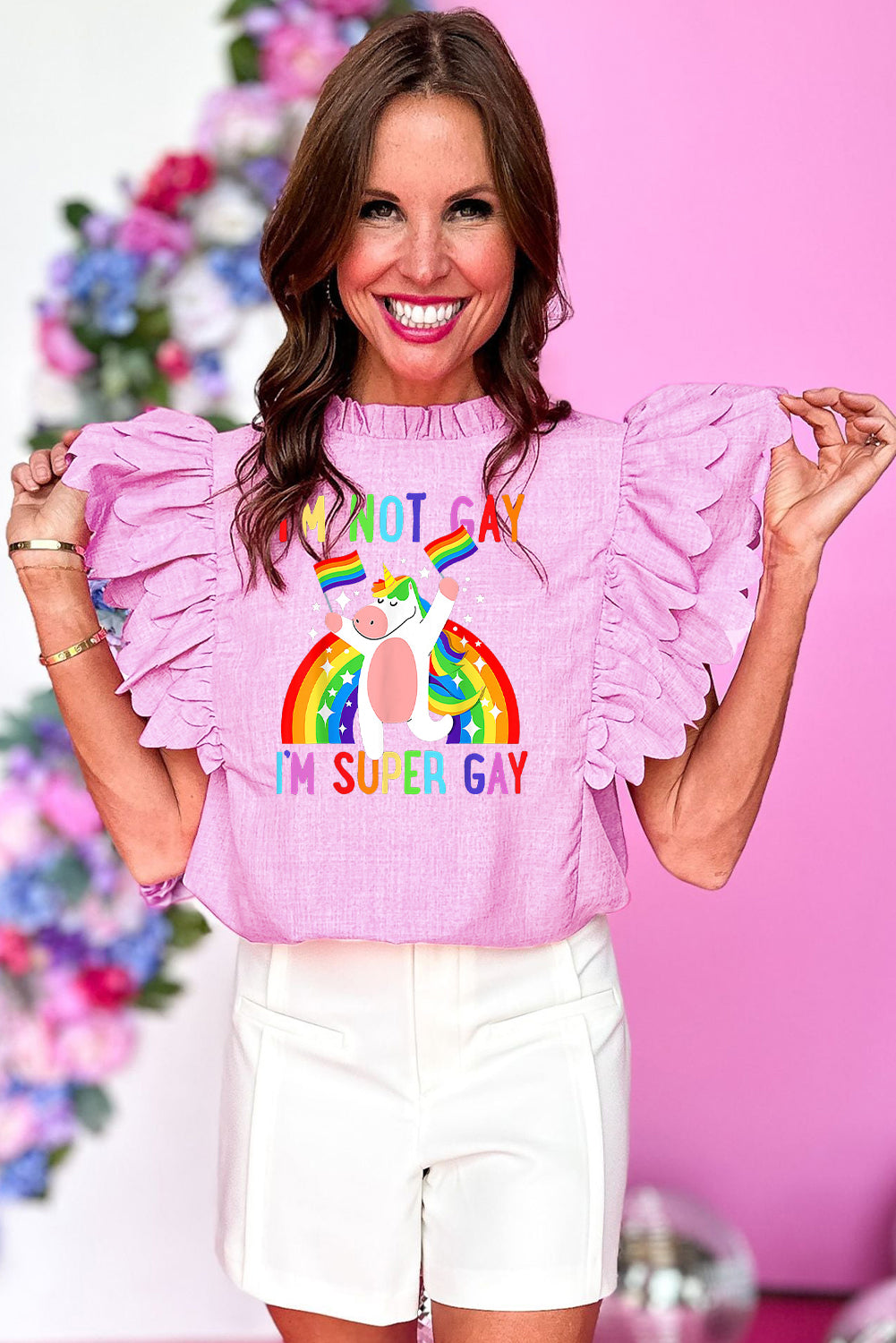 π Eye-Catching Design: This bright pink ruffle sleeve top features a playful unicorn graphic with rainbow accents, making it a fun, bold statement piece for casual outings and pride events.