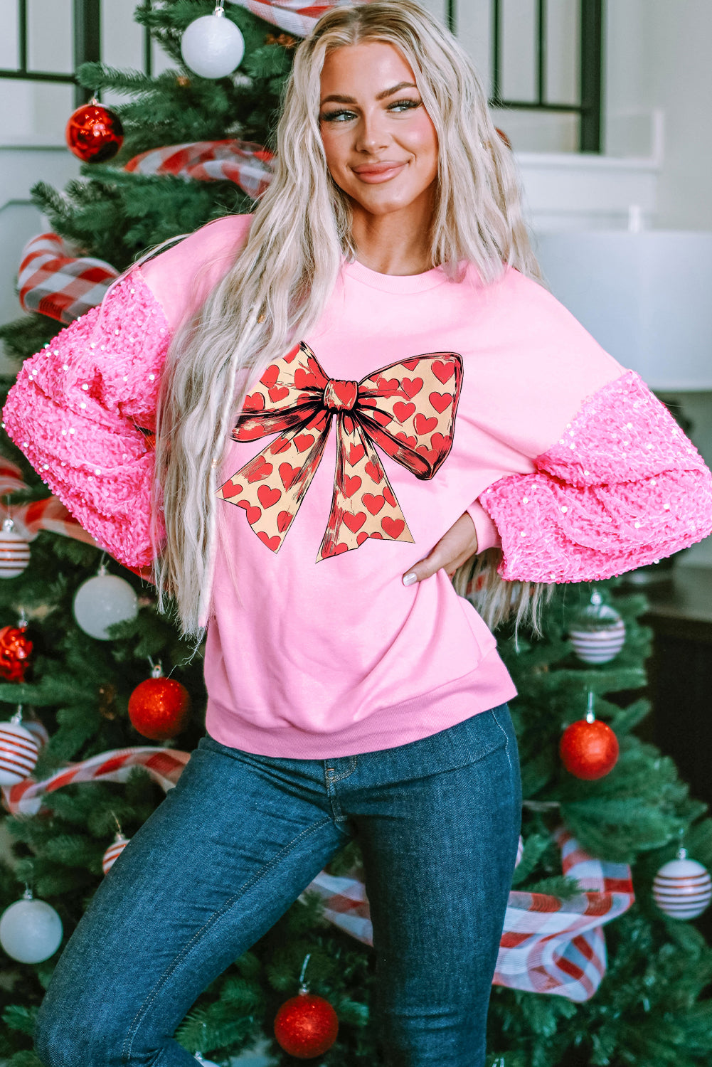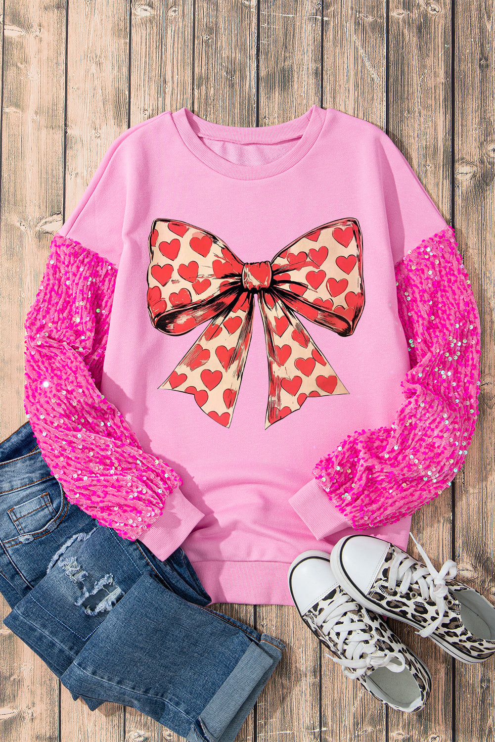 Valentine's Day Bow Heart Sequin Pullover Long Sleeve Sweatshirt