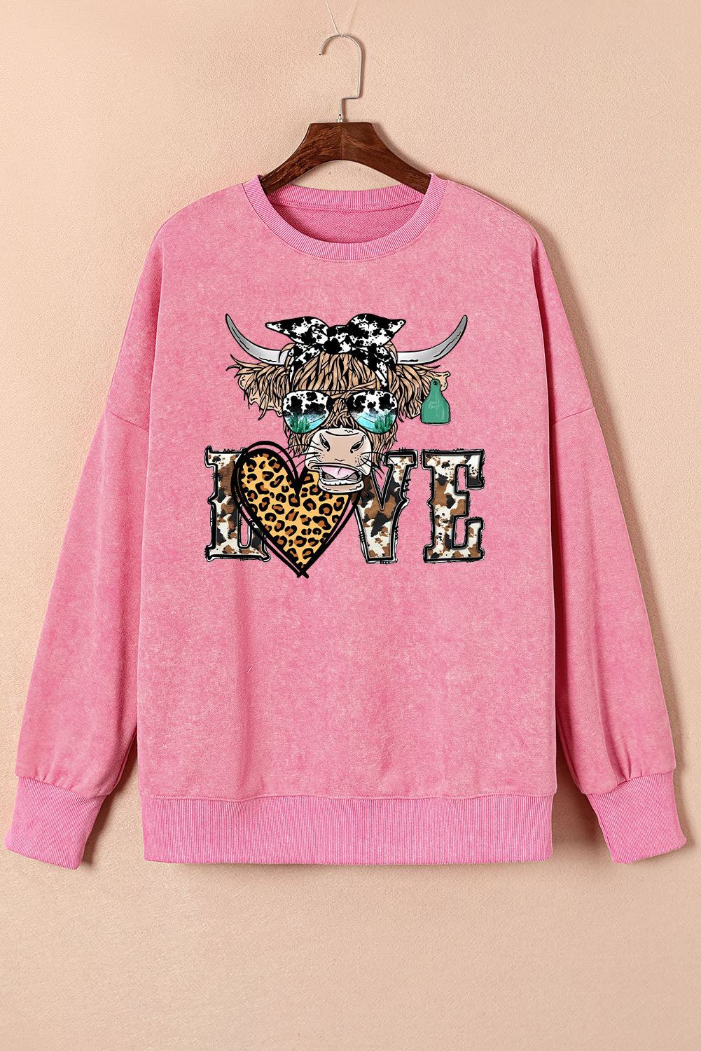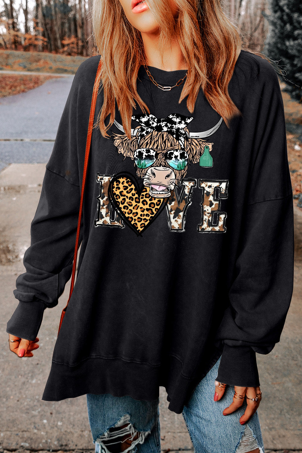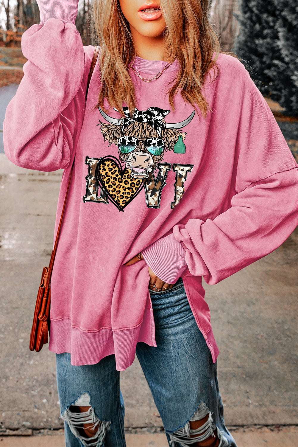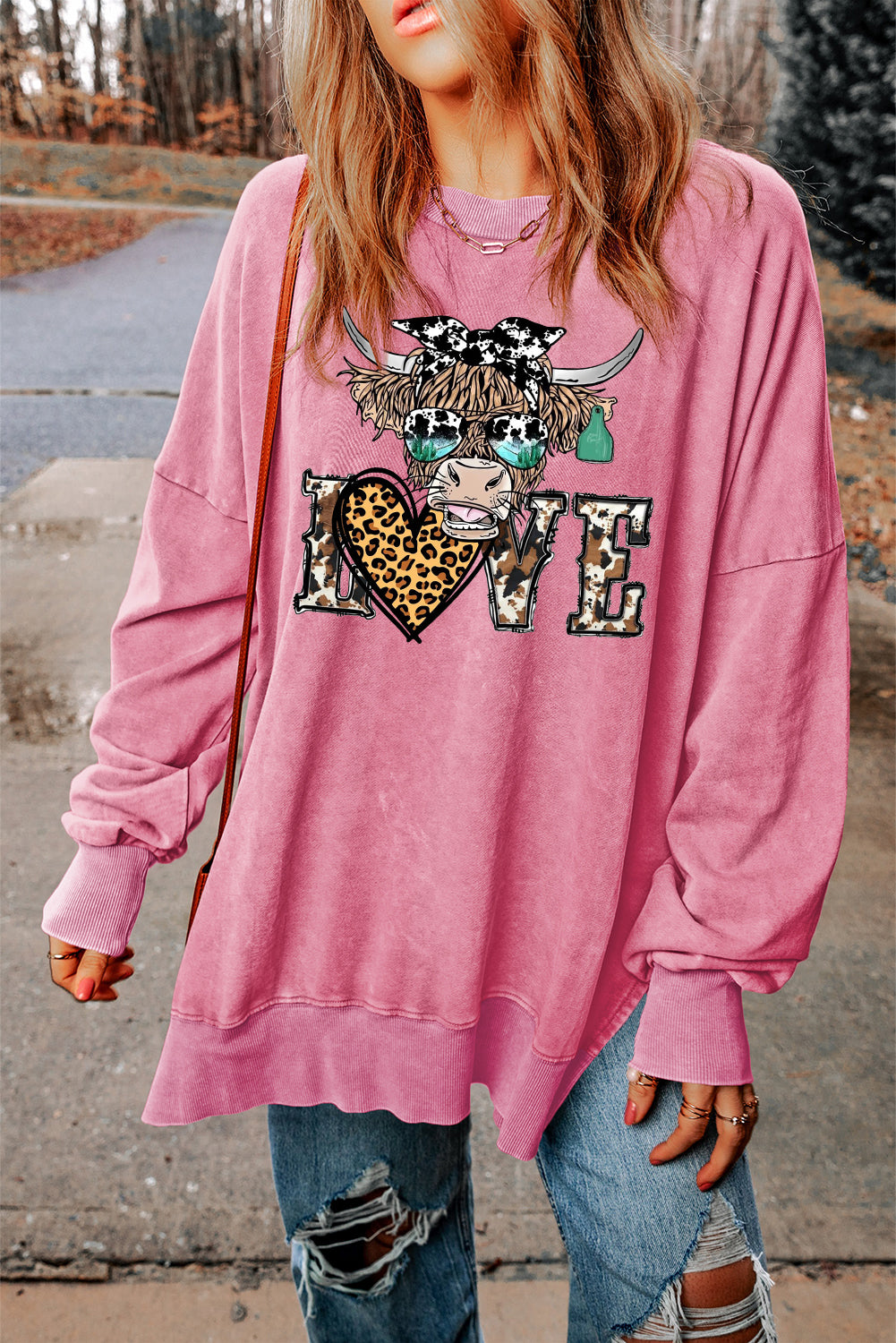 Valentine's Day Bull Heart Leopard Oversized Drop Shoulder Ribbed Sweatshirt