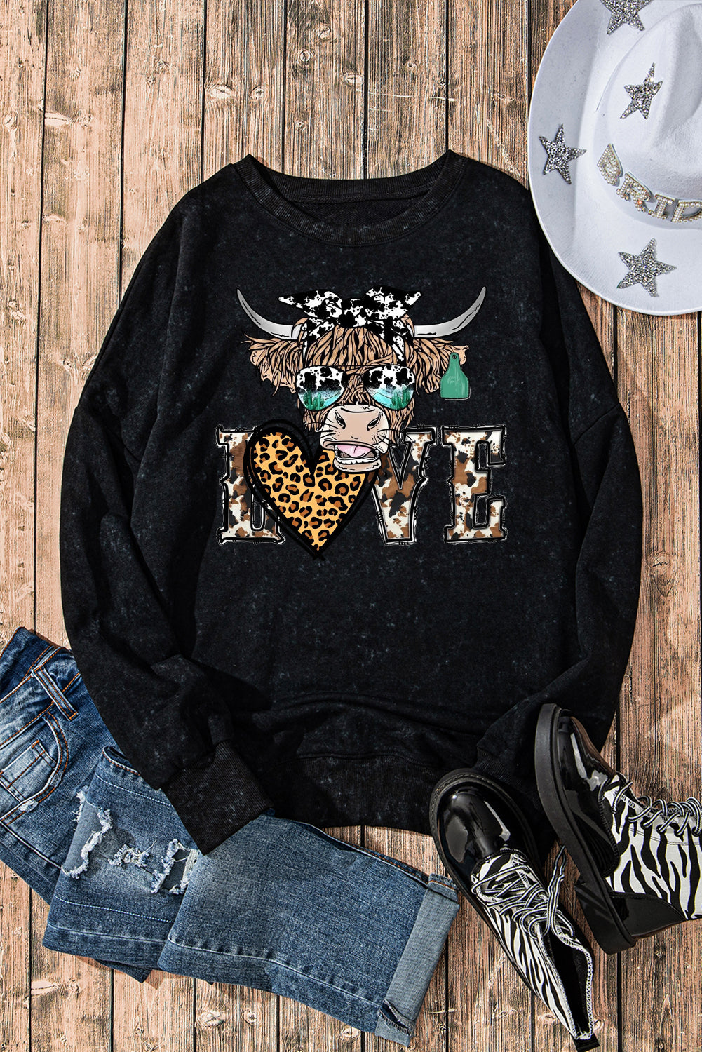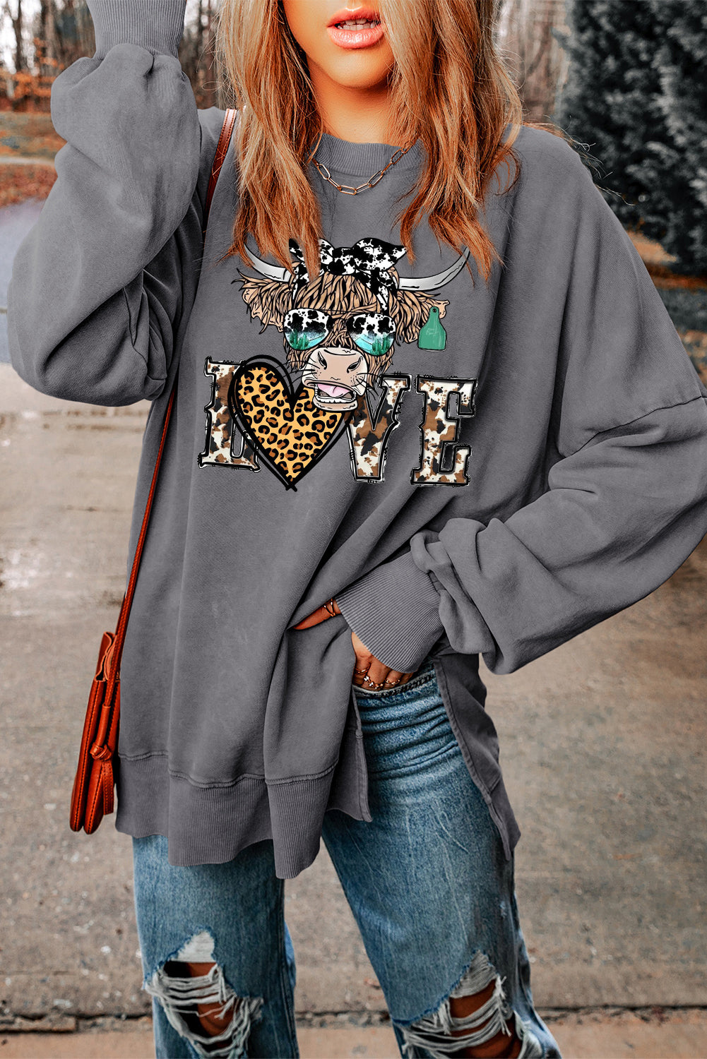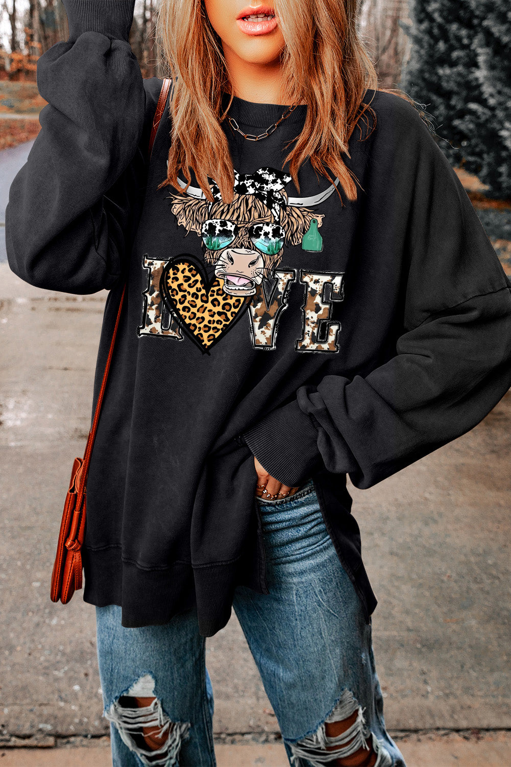 Valentine's Day Bull Heart Leopard Oversized Drop Shoulder Ribbed Sweatshirt