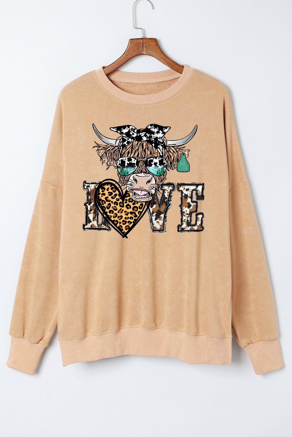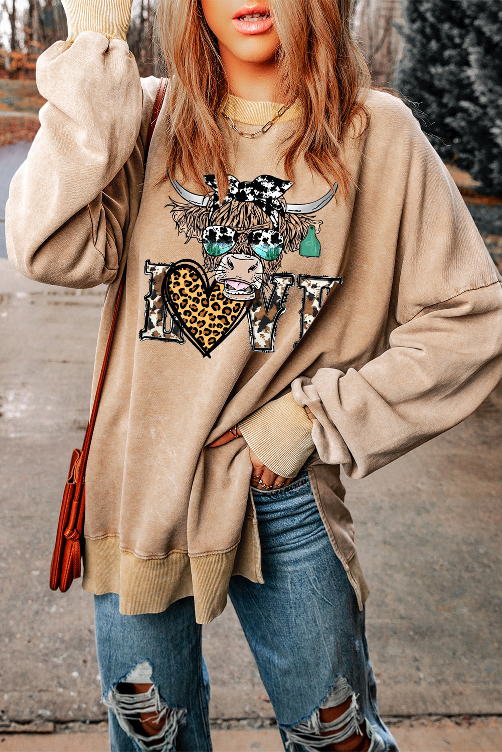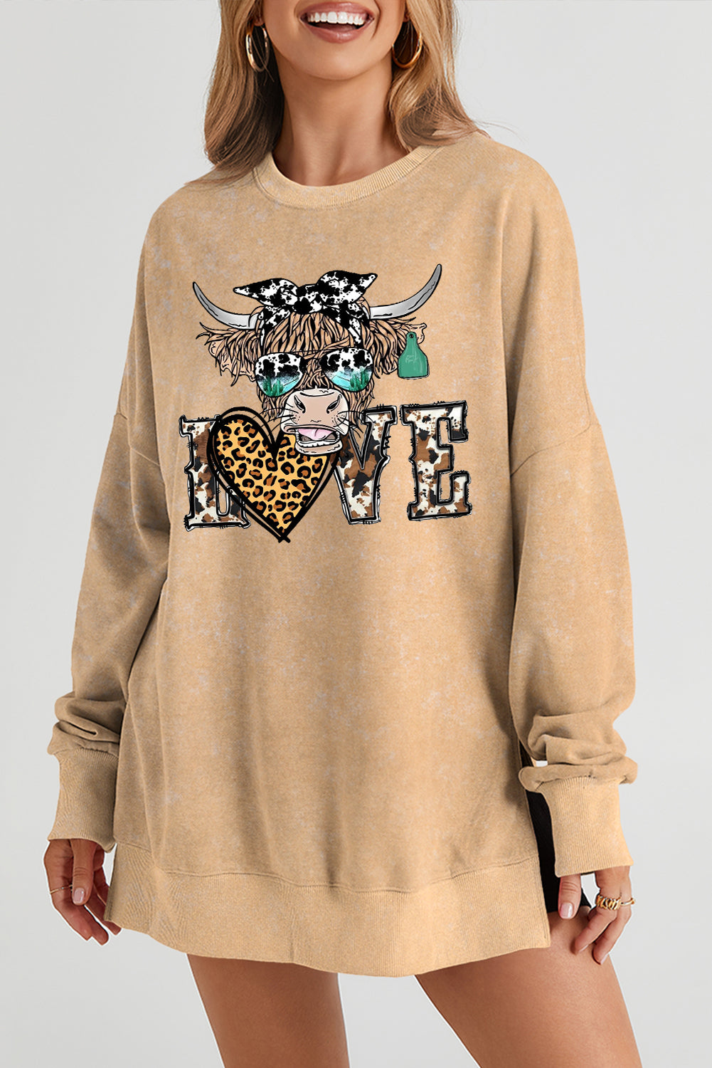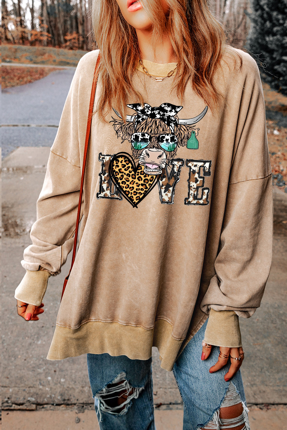 Valentine's Day Bull Heart Leopard Oversized Drop Shoulder Ribbed Sweatshirt