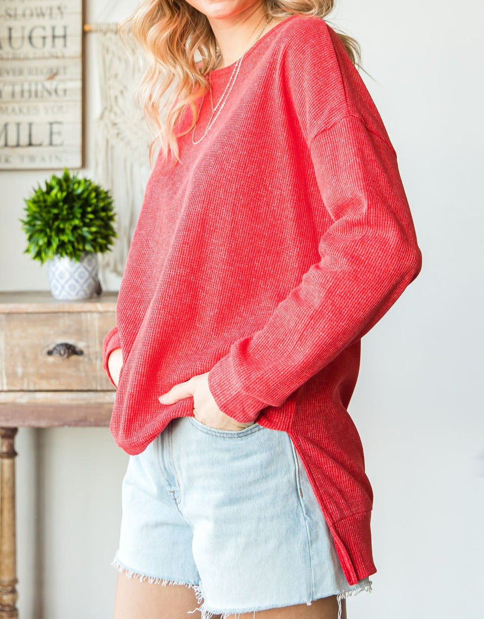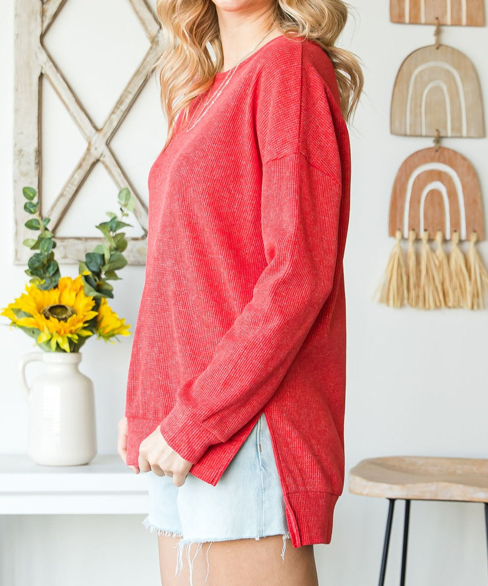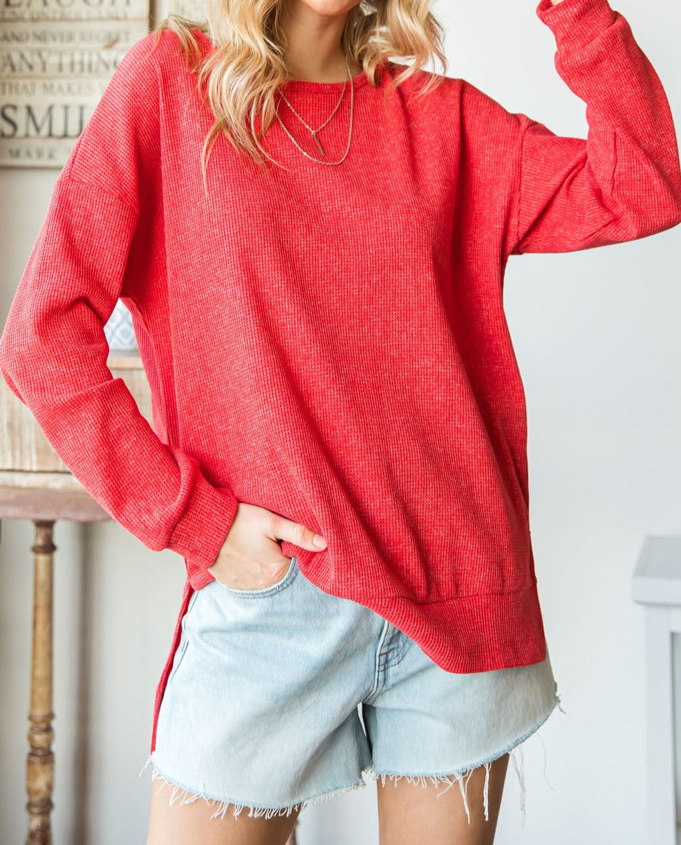 Waffle Knit Side Slit Pullover Top