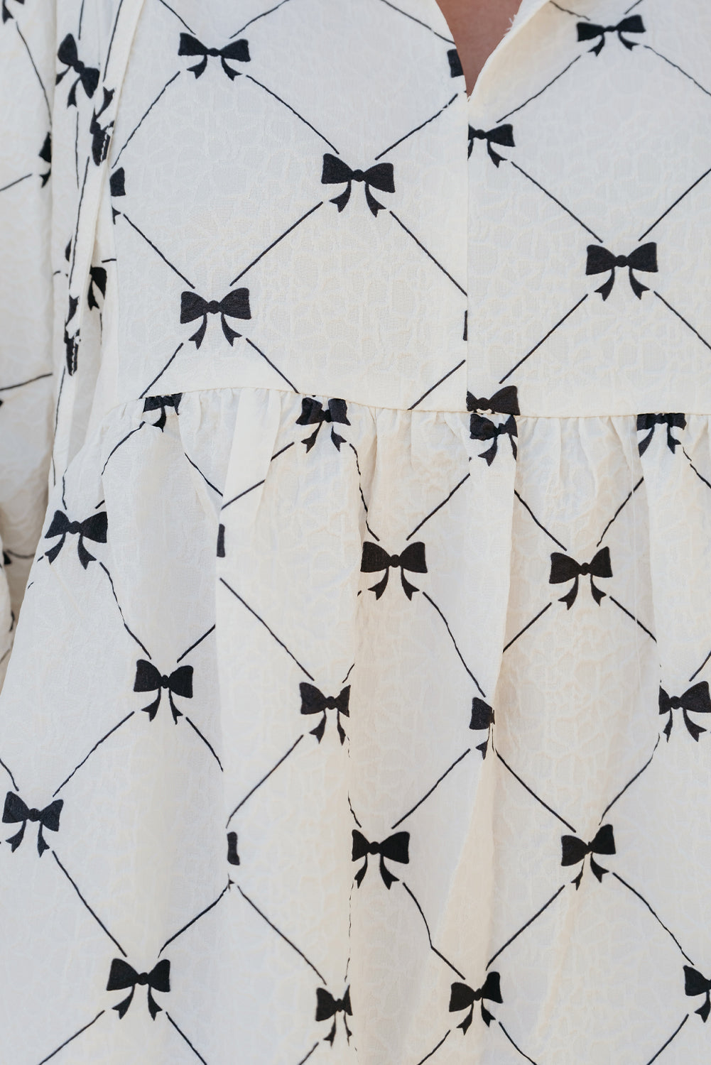 Bowtie patterns add a chic and stylish detail to the mini dress.